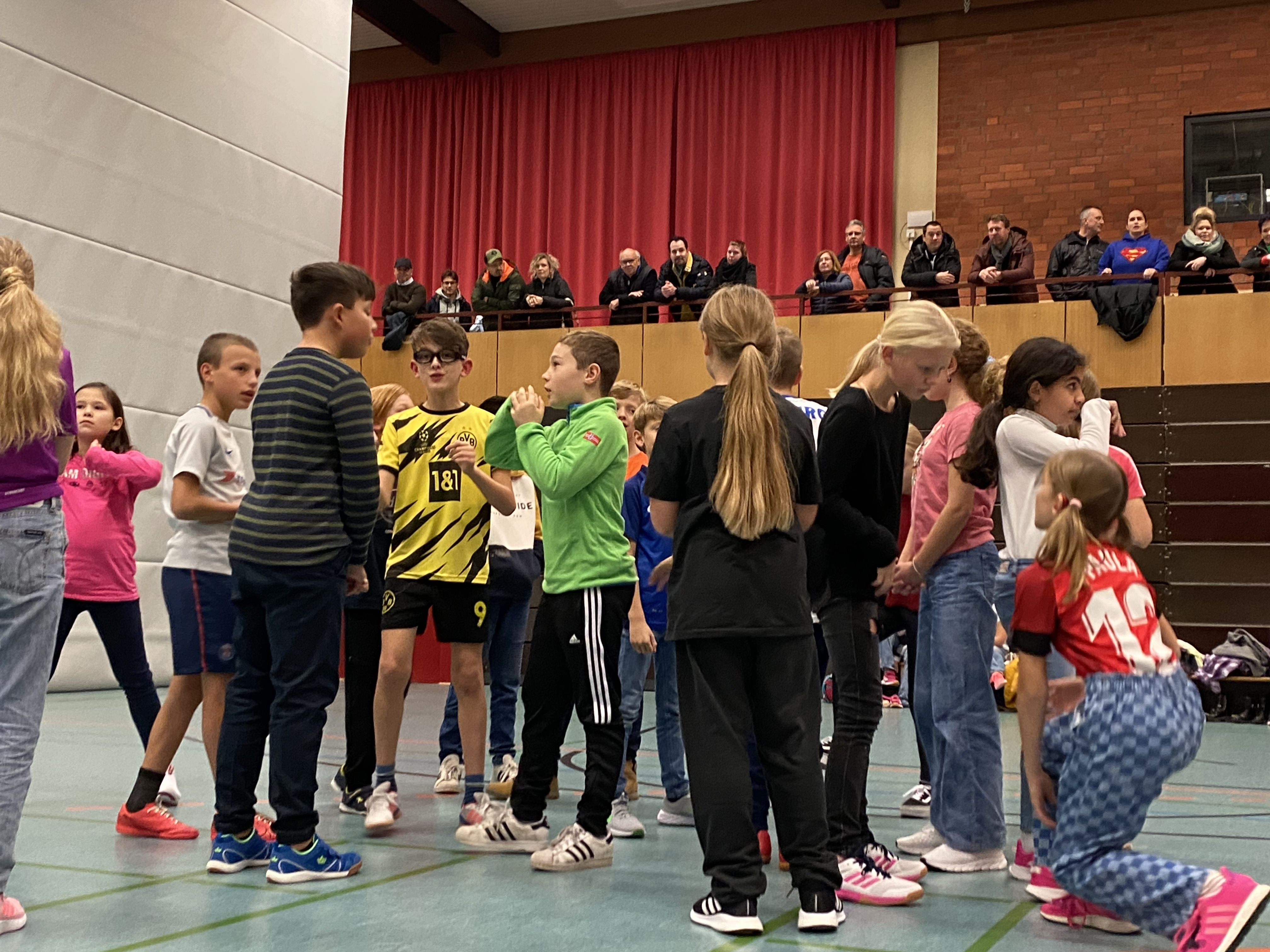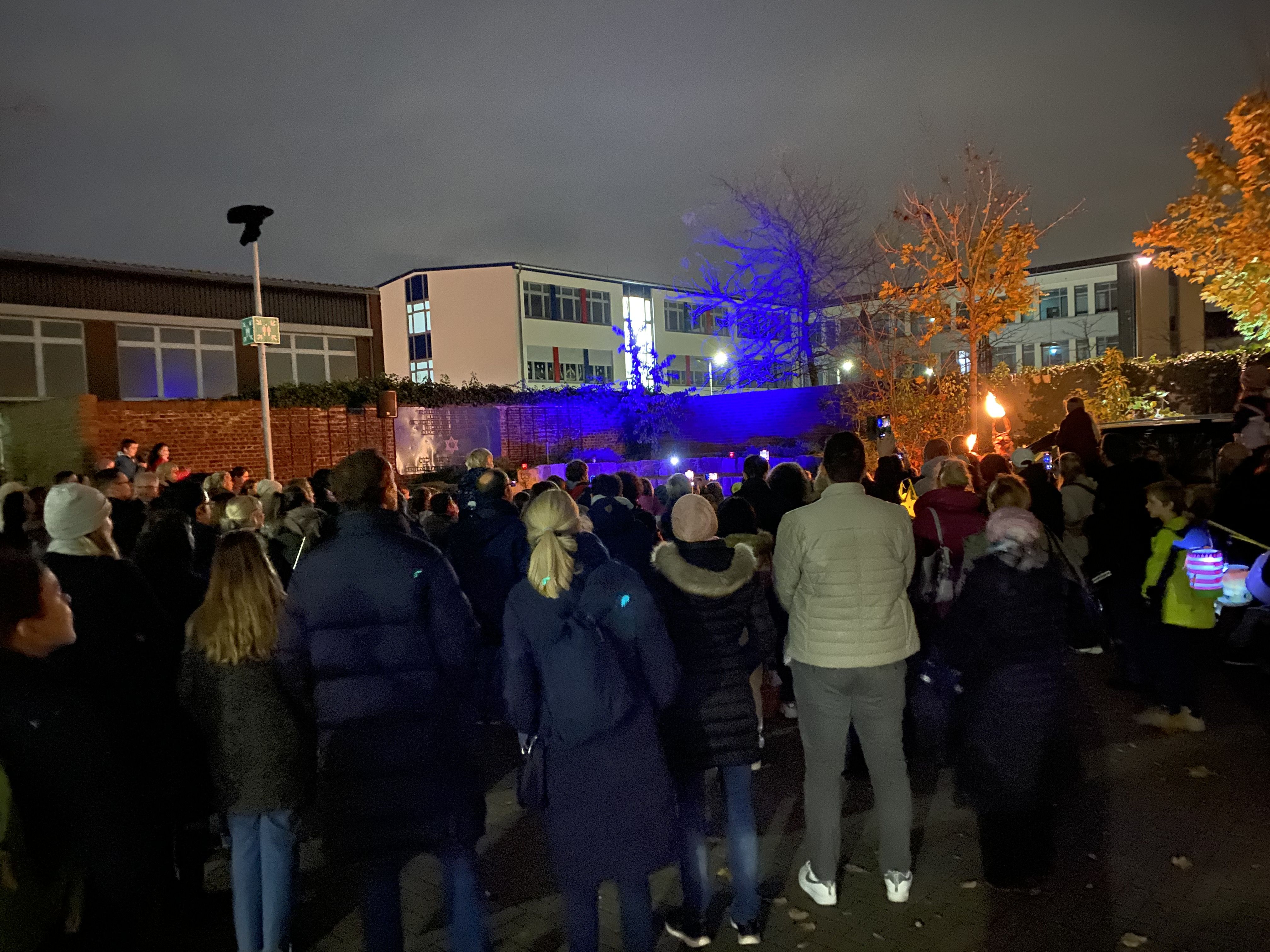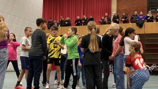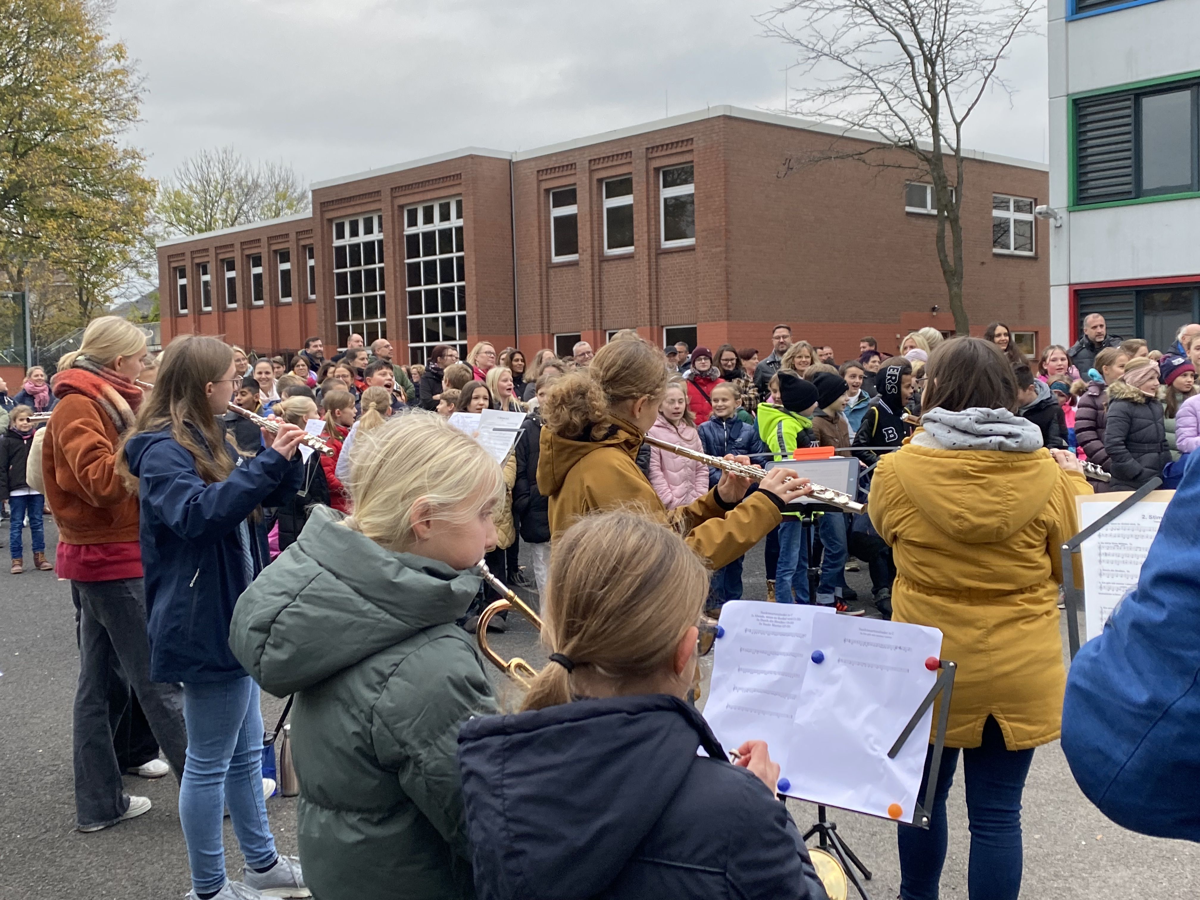 Nun lebte sie wieder auf: und zwar draußen beim Schein der Laternen. Musikalisch eingestimmt wurden alle Gäste von Wood 'n'Brass unter der Leitung von Philipp Niersmans und Katharina Adams. Das sportliche Begleitprogramm - ein Völkerballturnier aller 5. Klassen - sorgte für zusätzliche Bewegung, während ein Kreativangebot im Kunstraum den gemütlichen Teil für die Kinder darstellte. Die Eltern hatten Zeit und Gelegenheit für weitergehende Gespräche. Und nach einem feurigen Abschluss von Gerhard Leßmann, Zauberkünstler und Lehrer, gab es vom Elternverein noch für jedes der Kinder samt Geschwister und Gäste einen Weckmann.