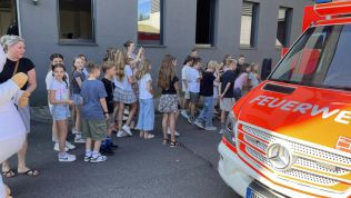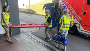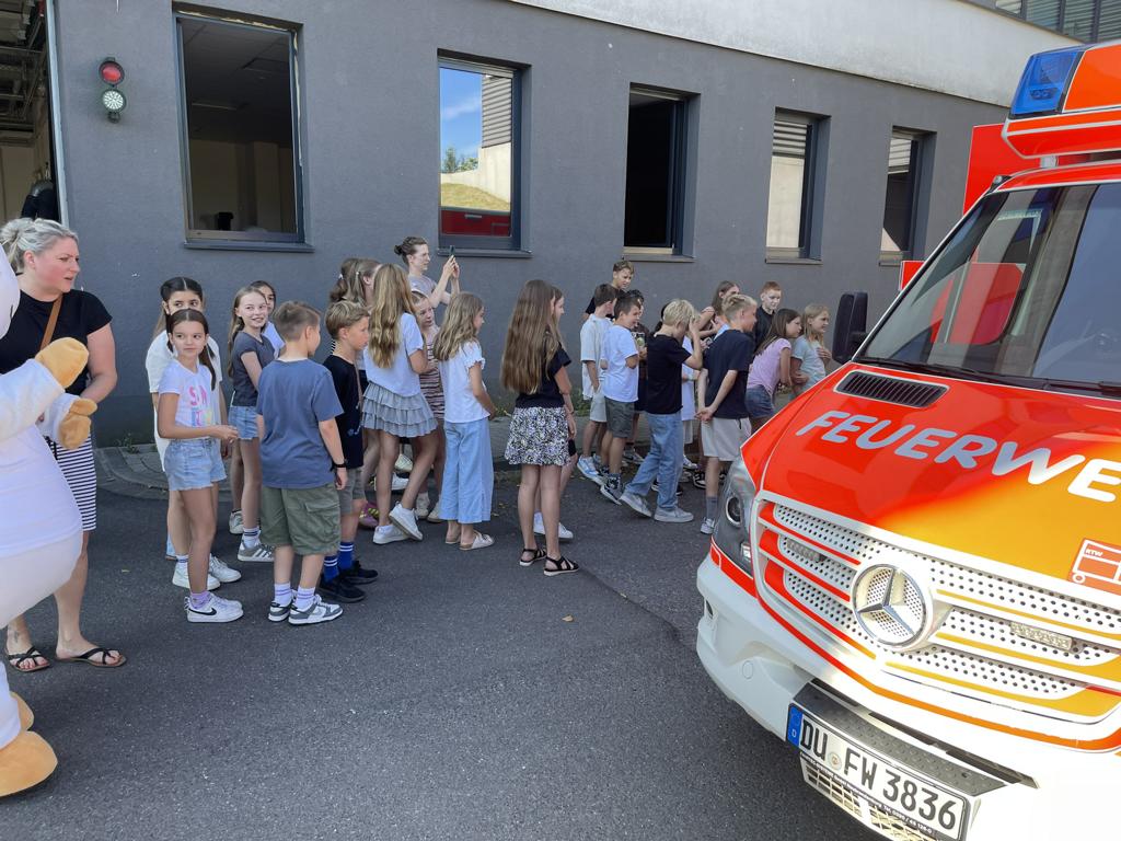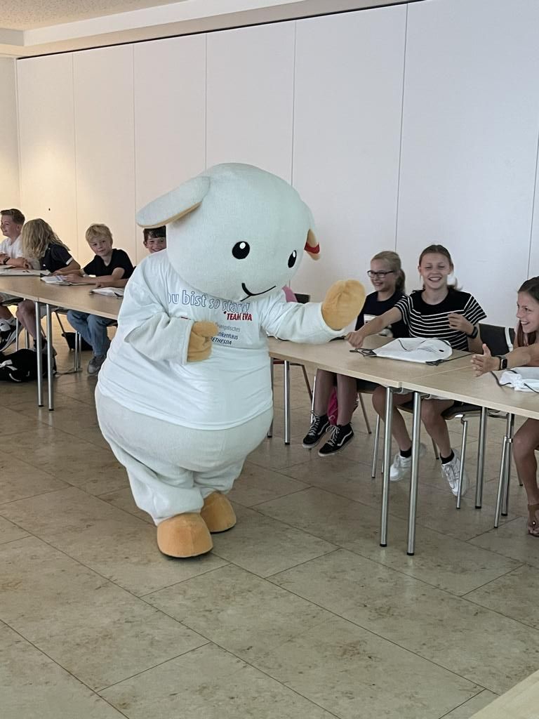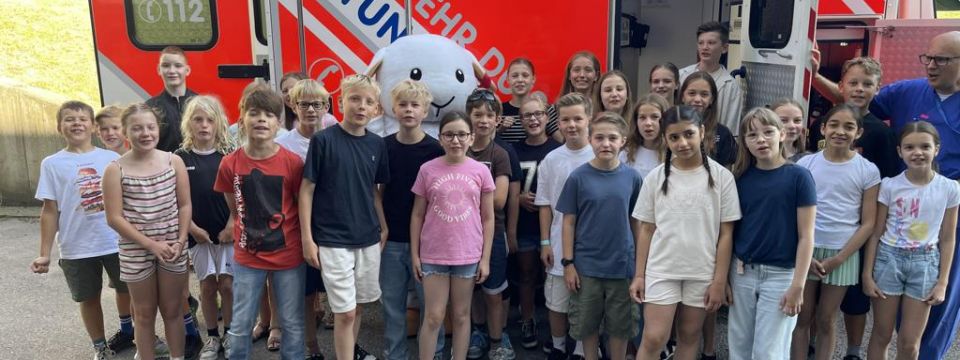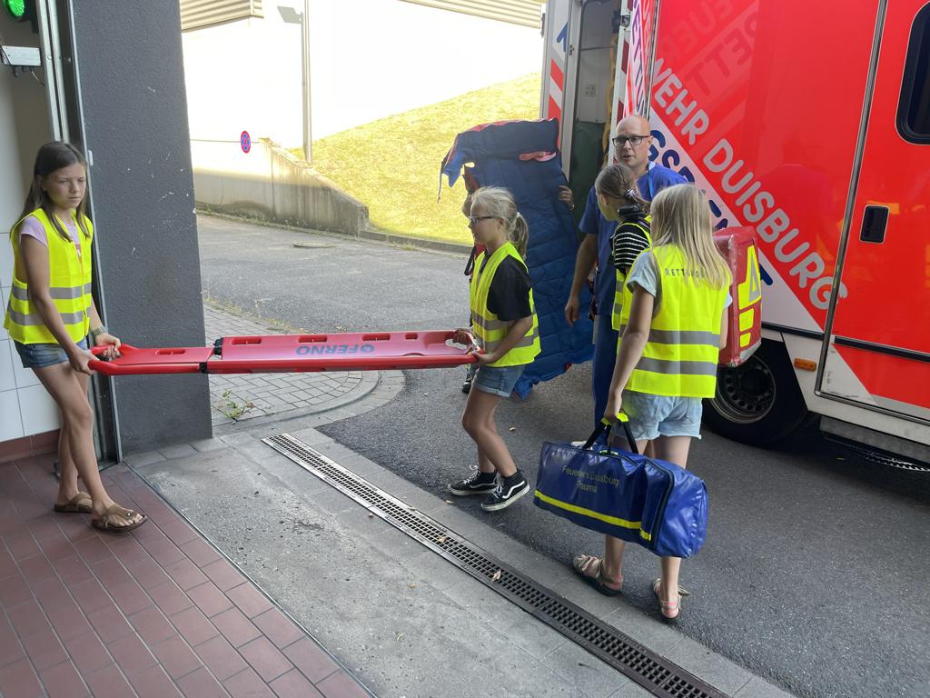 Am 30. Juni war die Klasse 5e im Evangelischen Klinikum Niederrhein in Duisburg. Dort wurden wir von Dominik Eisenburger empfangen, der dort als Anästhesist arbeitet und uns durch den Tag begleitet hat. Zunächst wurden wir in einen Besprechungsraum geführt, wo uns bereits die erste Überraschung erwartete: auf jedem Platz gab es als Gastgeschenk einen Turnbeutel mit dem Logo des Klinikums, gefüllt mit Süßigkeiten und einem Jojo. Während der anschließenden Präsentation hat uns Herr Eisenburger über seinen Beruf als Anästhesist, über seine Tätigkeiten informiert und unsere zahlreichen Fragen beantwortet. Mitten in dieses Gespräch platzte das süße Schaf Eva – das Maskottchen des Klinikums. Eva begleitete uns anschließend auch zum Notarzteinsatzfahrzeug (NEF) und zum Rettungswagen (RTW).