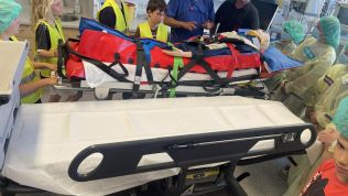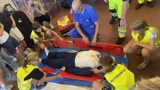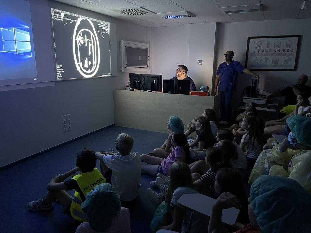 Pepe (die Übungspuppe), den wir schon während der Präsentation kennengelernt hatten, hatte nun einen schweren Fahrradunfall, und er fuhr ohne Helm. In den folgenden Stunden kümmerten wir uns daher um ihn, indem wir Ersthelfer und das Rettungsteam einteilten, ihn mit dem Stifneck, der Schaufeltrage und der Vakuummatratze versorgten und ihn sicher in den Rettungswagen luden. Von der ganzen Arbeit ausgehungert stärkten wir uns im Besprechungsraum, bevor wir im Schockraum die Behandlung von Pepe fortsetzten. Hier durfte jeder von uns unter Anleitung von Herrn Eisenburger ein Ultraschall am Hals machen. Danach haben wir Pepe in das CT gelegt und anschließend in einem Besprechungsraum die Röntgenbilder (die natürlich nicht live aufgenommen, sondern im Vorfeld vom Personal mittels Kinder Joy-Eier vorbereitet wurden) ausgewertet. Nach dem finalen Gruppenfoto endete unser Ausflug und wir können festhalten: wir hatten einen sehr schönen Tag mit Pepe!