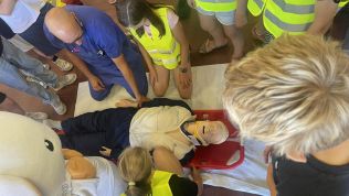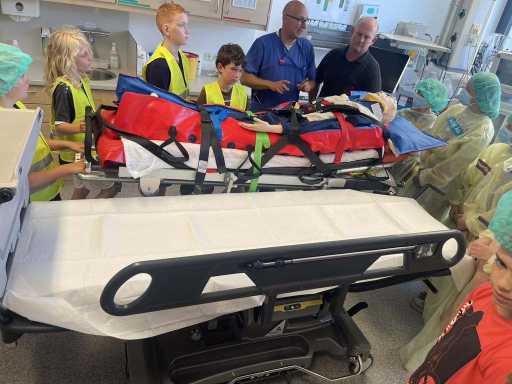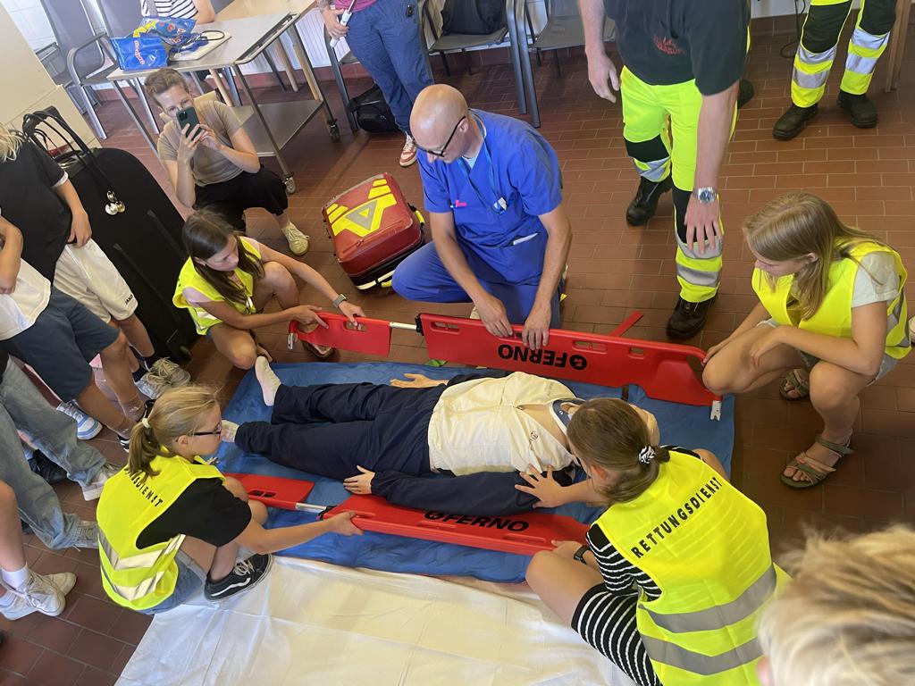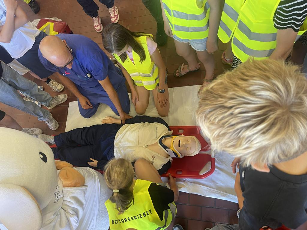 Am 30. Juni besuchte die Klasse 5e das Evangelische Klinikum Niederrhein in Duisburg. Begleitet vom Anästhesisten Dominik Eisenburger erlebten die Schülerinnen und Schüler einen spannenden Tag voller Überraschungen, medizinischer Einblicke und praktischer Übungen mit der Übungspuppe Pepe. Besonders das Maskottchen Eva und die Versorgung eines „Unfallopfers“ machten den Tag zu einem unvergesslichen Erlebnis.