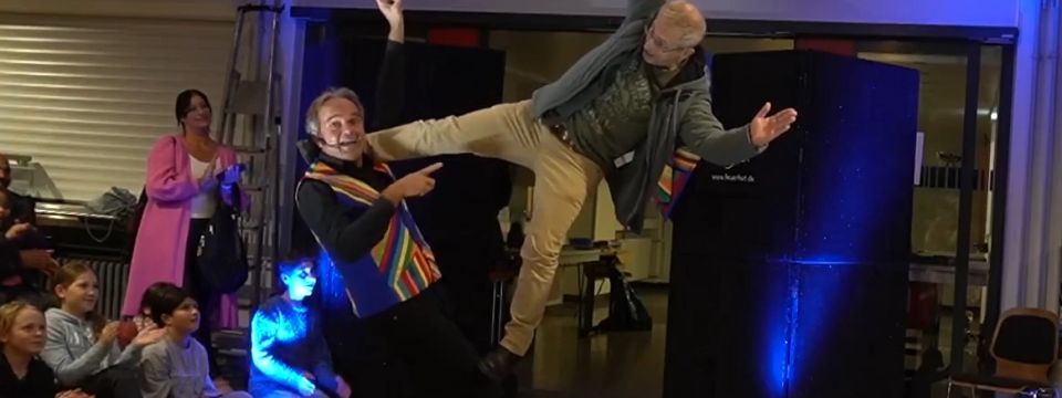 Zehn lange Kaffeetafeln in der Pausenhalle boten Raum für gemütliche Gespräche, während in der Turnhalle die Referendarinnen und Referendare ein Völkerballturnier der Klassen 5a bis 5e veranstalteten. Weitere Referendarinnen boten ein abwechslungsreiches Bastelangebot im Kunstraum an. Der Nachmittag klang spektakulär aus, mit den Zaubereien und Akrobatikeinlagen von Gerhard Leßmann, Kollege der Schule und selbstständiger Zauberkünstler. Hier ein paar Impressionen seines Auftritts.