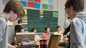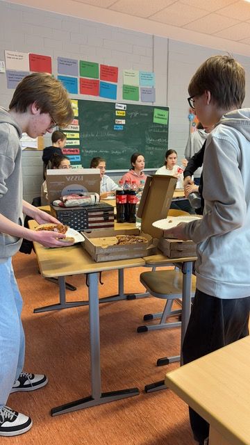 Damit der Nachmittag auch kulinarisch in amerikanischem Flair erstrahlte, hatten die Klassensprecher Hannes und Jakob im Vorfeld American Pizza organisiert. Doch damit nicht genug: Als Überraschung zauberten die Klassensprecher ein Dessert auf den Tisch – knusprig-süße American Chocolate Chip Cookies, die die Vorfreude auf die anstehende virtuelle Tour steigerten.