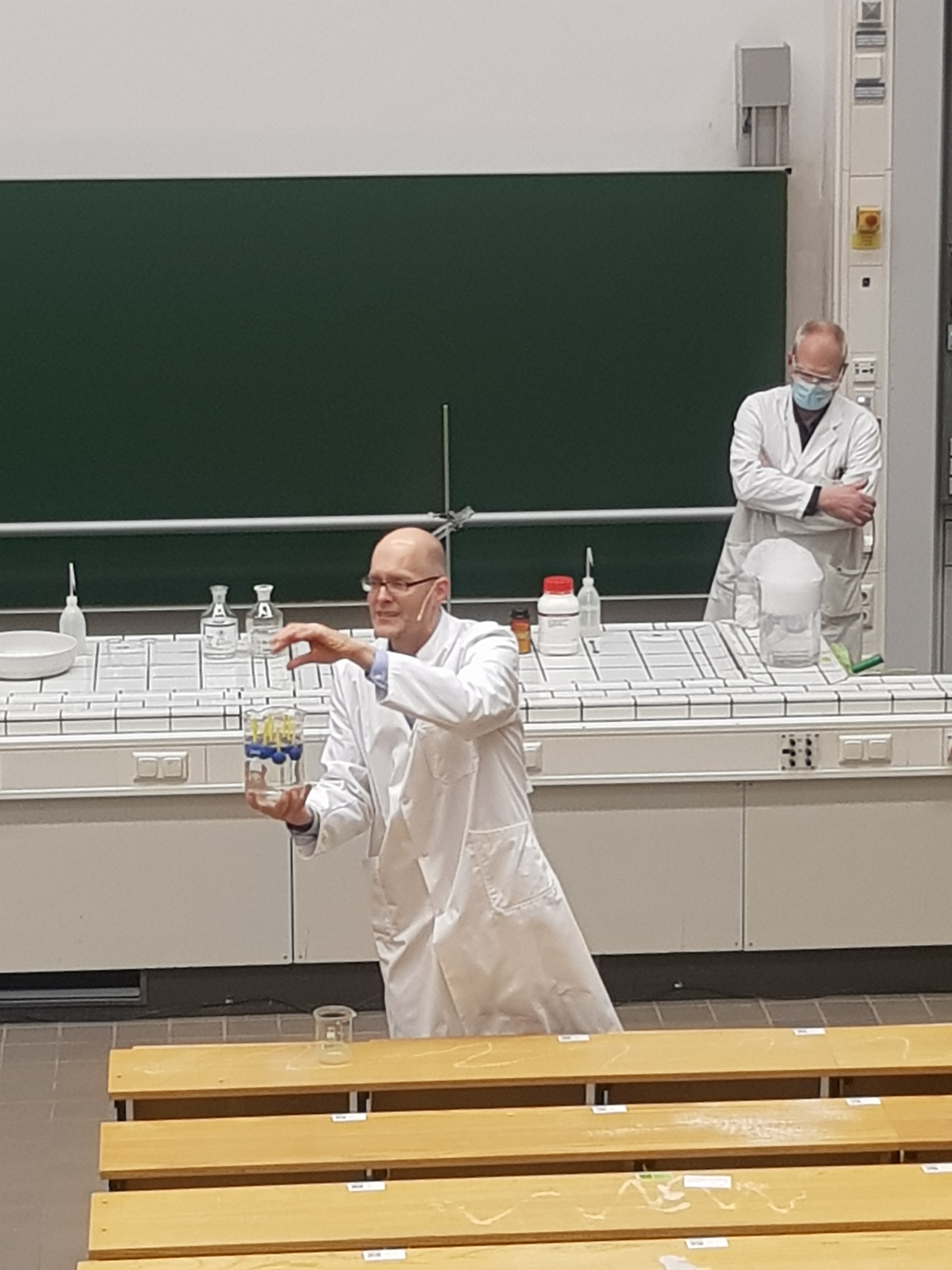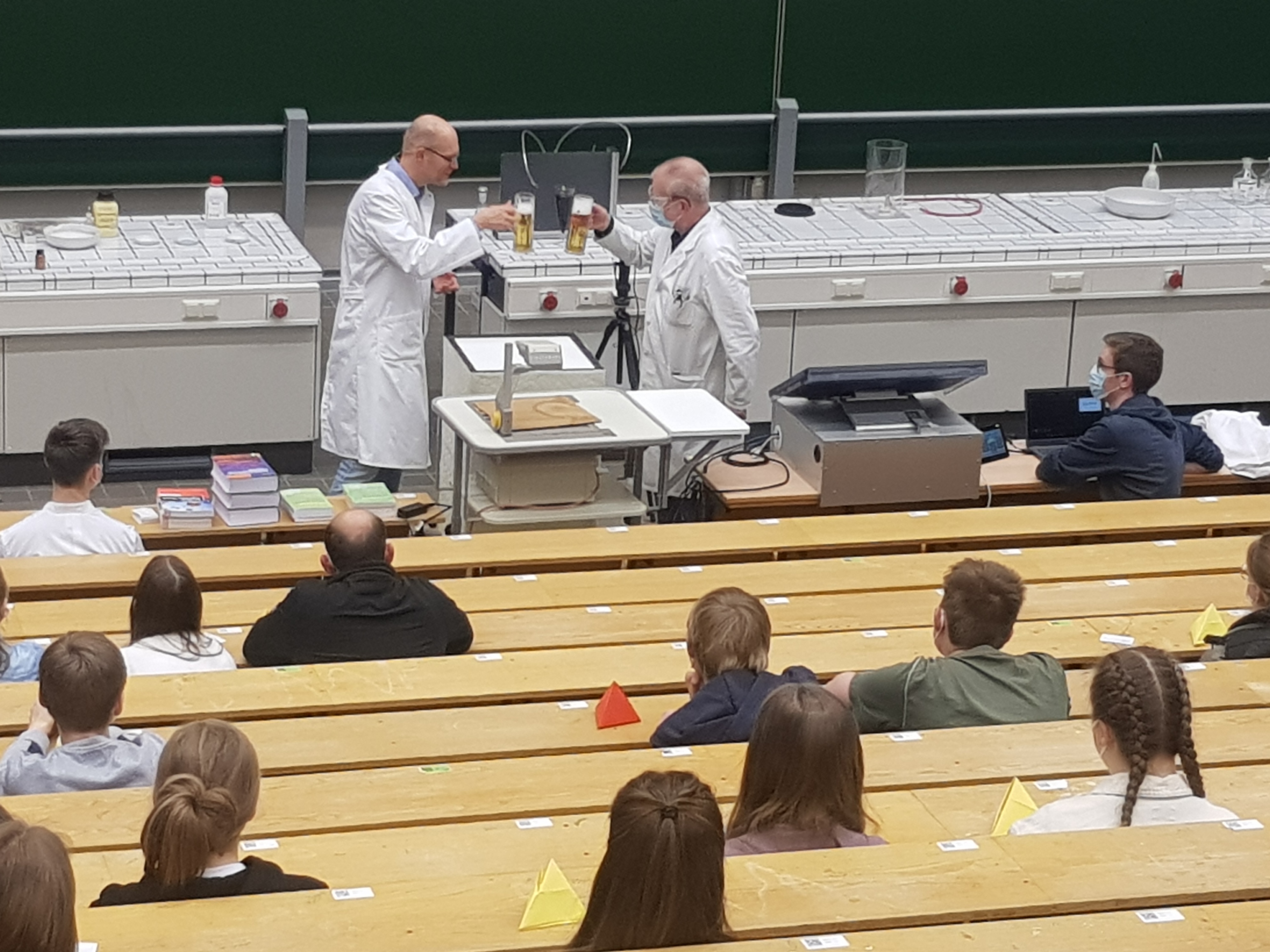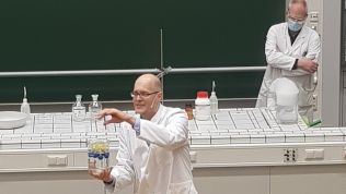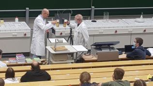 Das Highlight der Veranstaltung war der Auftritt von Professor Frank Glorius. Er zeigte im Hörsaal eindrucksvolle Experimente wie den „Tod eine Gummibärchens“ (exotherme Zersetzung von Zucker), „weinender Kastanienzweig“ (Chemolumineszenz) und „chemisches Bier“ (Landolt'sche Zeitreaktion) und vermittelt mit Begeisterung damit unter anderem am Beispiel der Bierbraukunst den angereisten Schülerinnen und Schülern, dass Chemie Kult(ur) ist!
