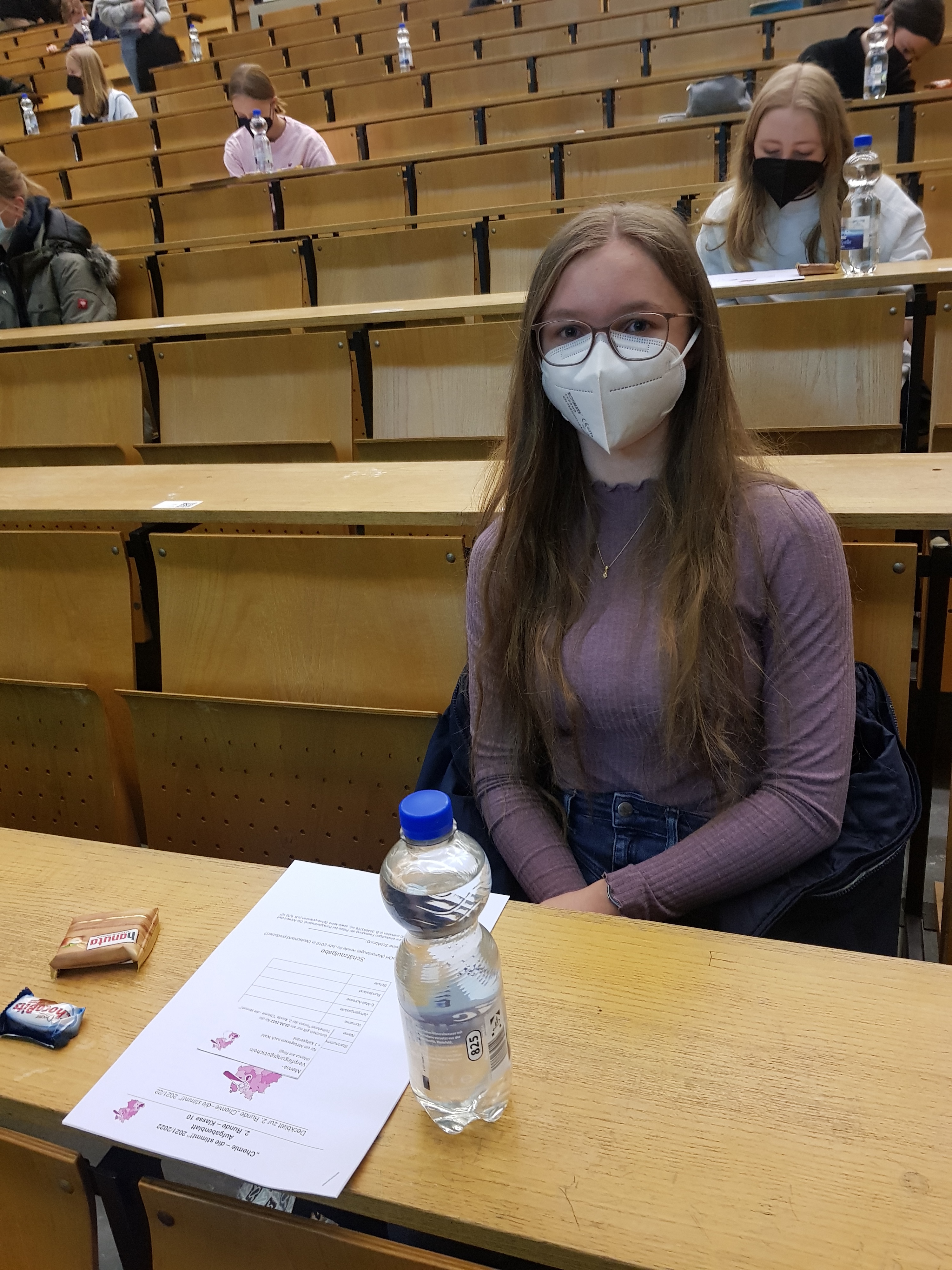 Als eine von 45 Schülerinnen und Schülern aus ganz NRW qualifizierte sich Carola Klebuch in der ersten Runde unter fast 500 Teilnehmern für diese Klausurrunde auf Landesebene und wurde eingeladen einen vollen Tag mit Klausur, Mensaerlebnis, Experimentalvortrag und Siegerehrung zu genießen. Und das war deutschlandweit durchaus besonders: Nur drei Bundesländer, darunter NRW, boten die Möglichkeit diese Klausurrunde in Präsenz zu erleben; der Rest führte die Klausur digital durch.