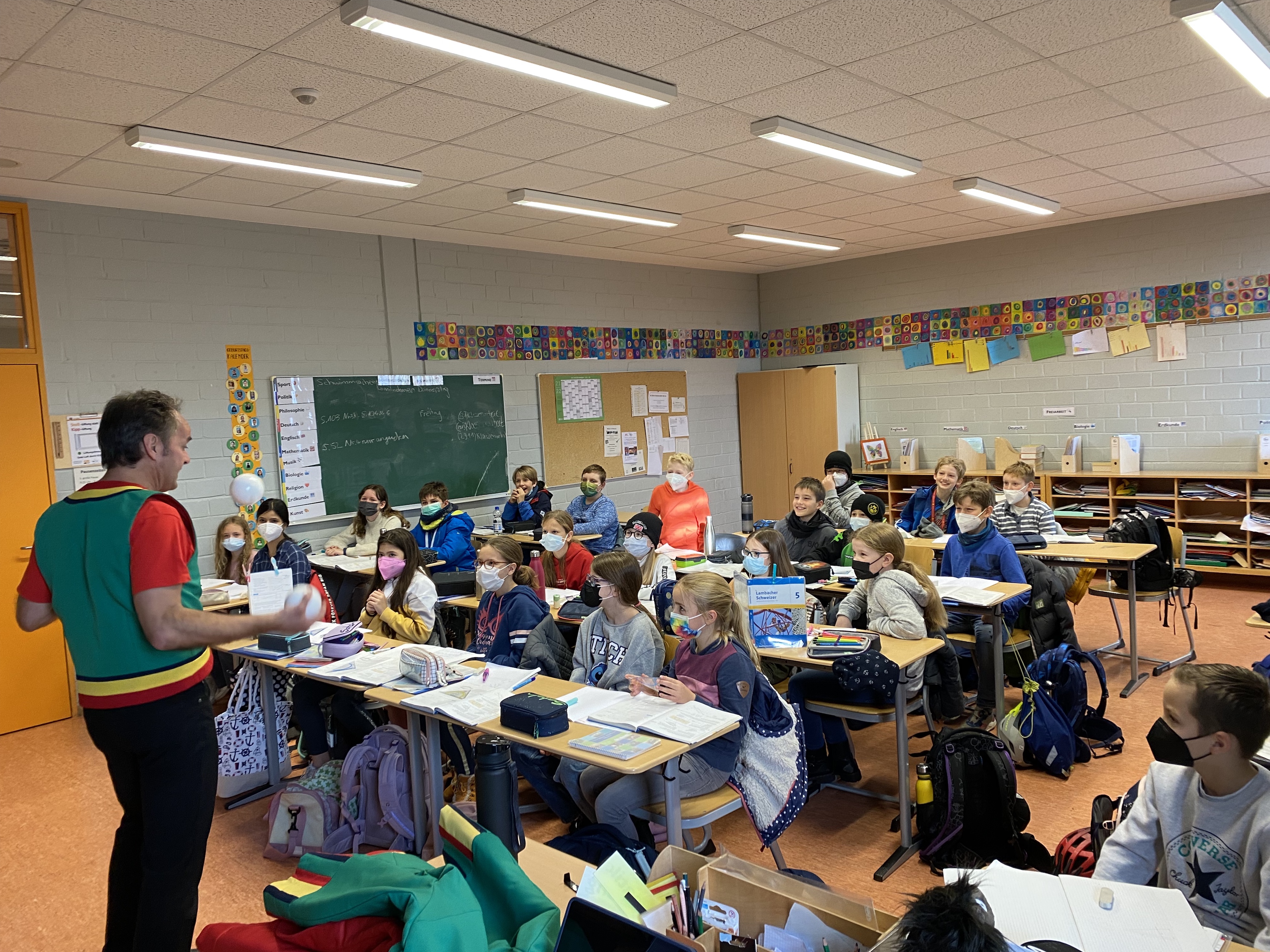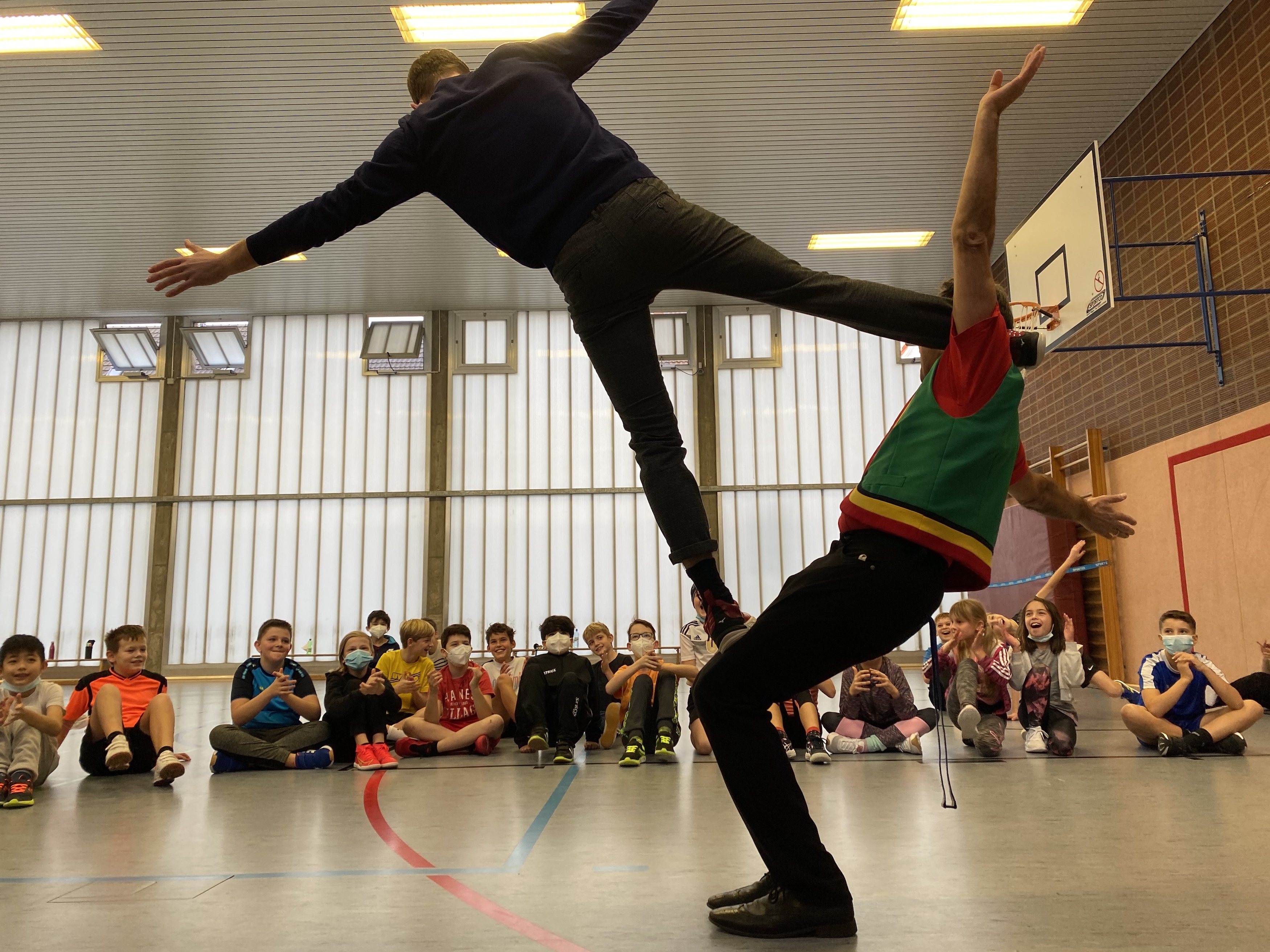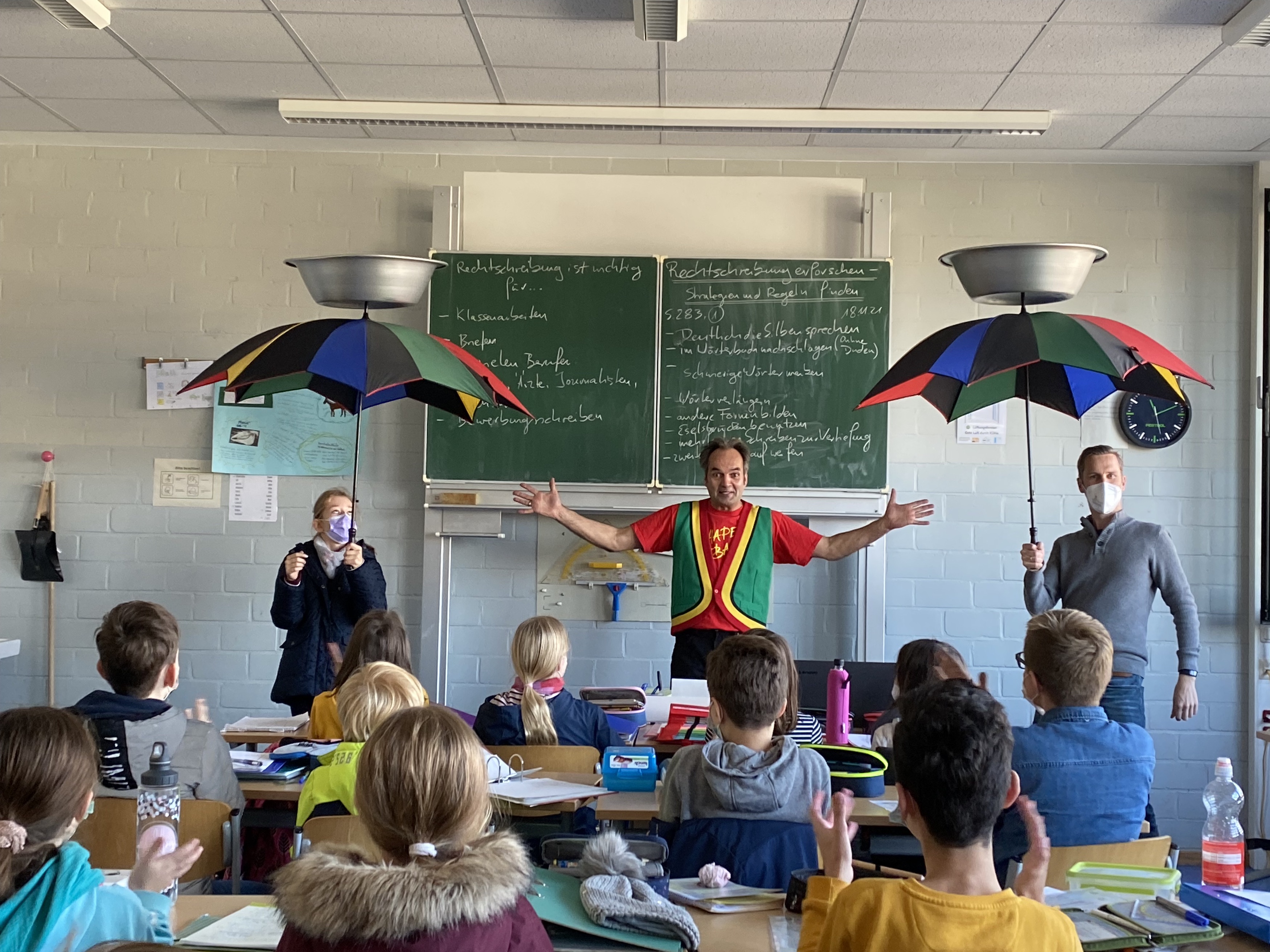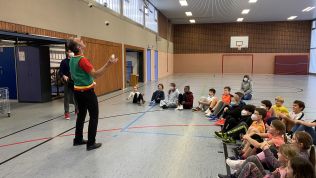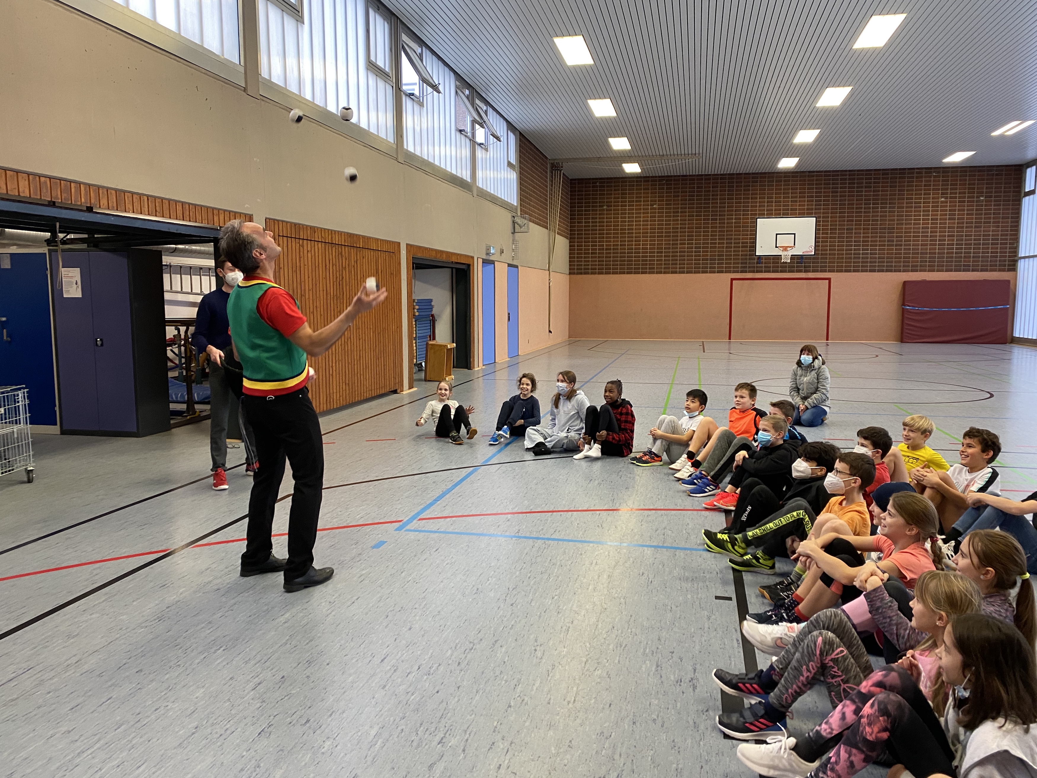 Gerhard Leßmann - professioneller Artist und Zauberkünstler - jonglierte unter der Mitwirkung der Klassenlehrerinnen und -lehrer auf so beeindruckende Weise, dass so manchem Schüler die Luft wegblieb. "Das war cool!", kam es aus den Reihen der Schülerinnen und Schüler, die den Auftritt mit großem Applaus begleiteten.