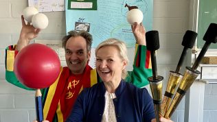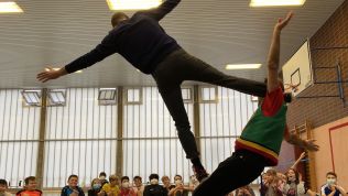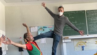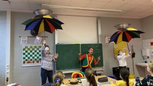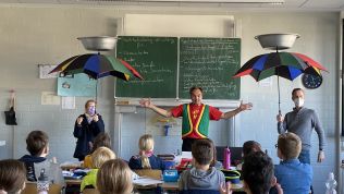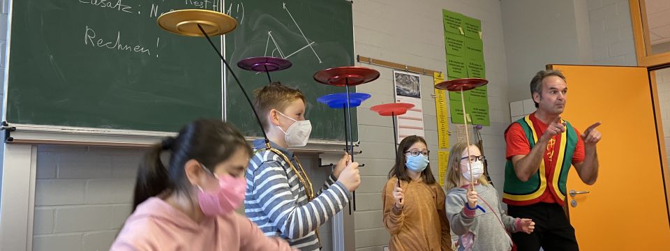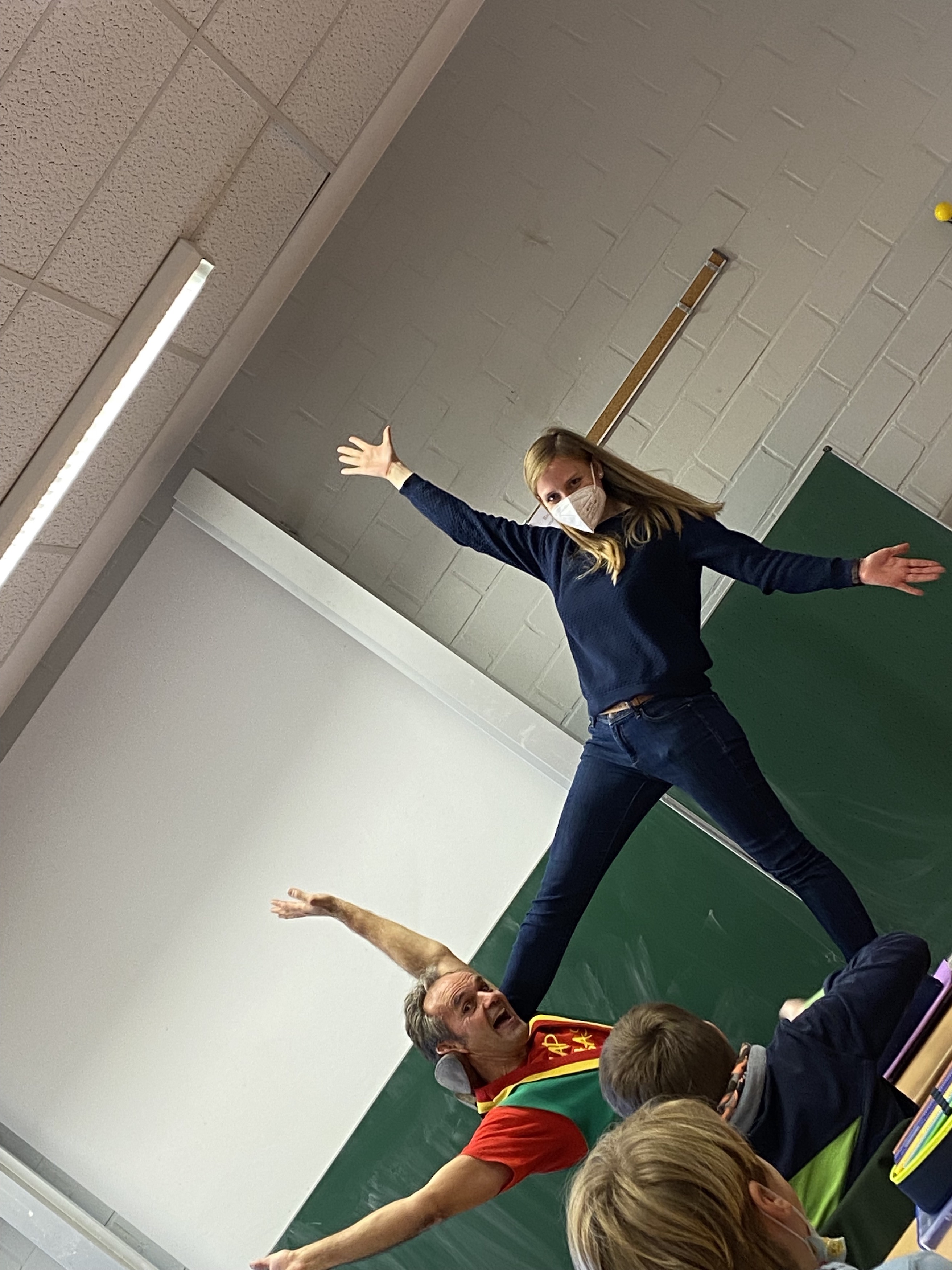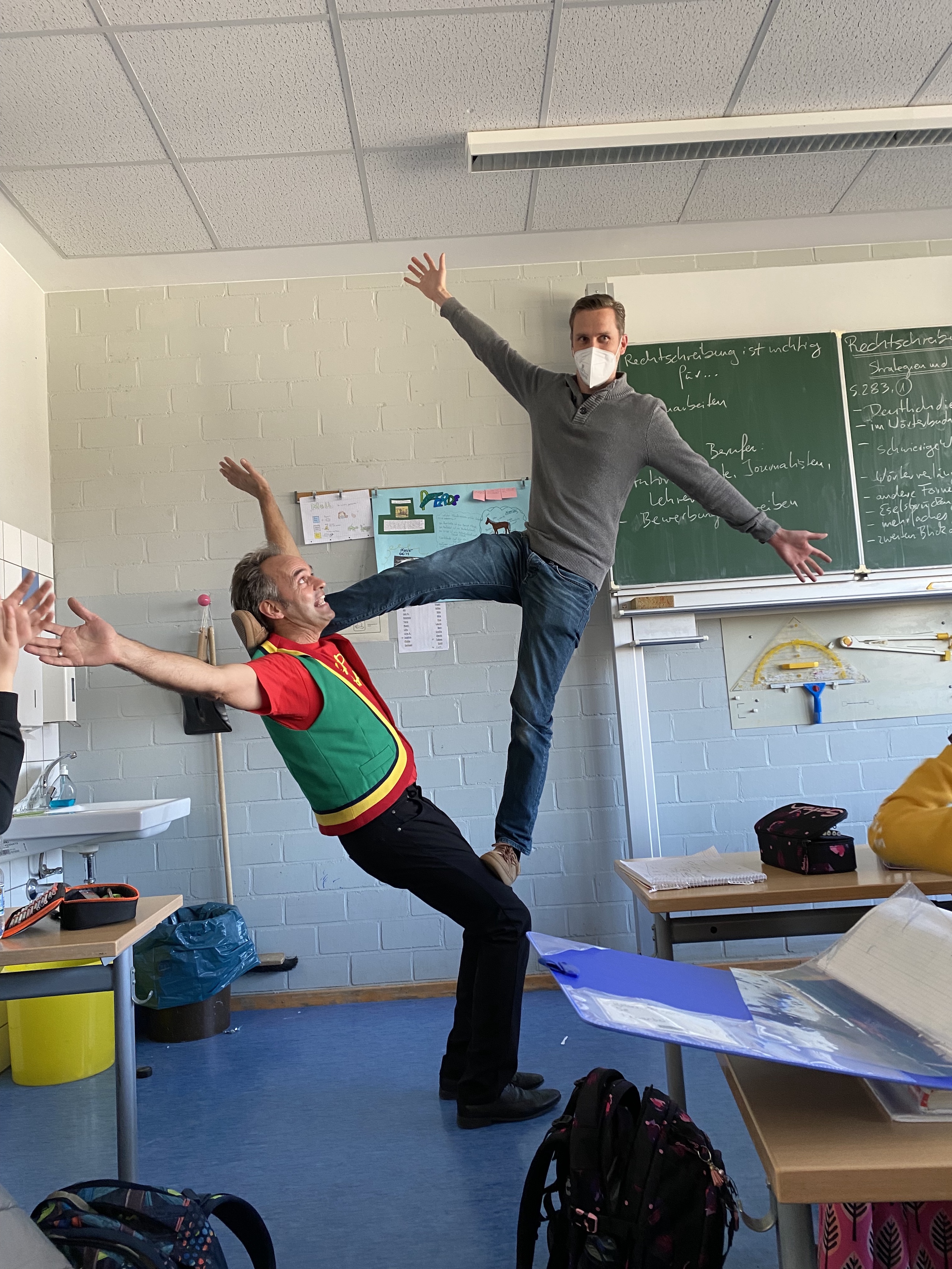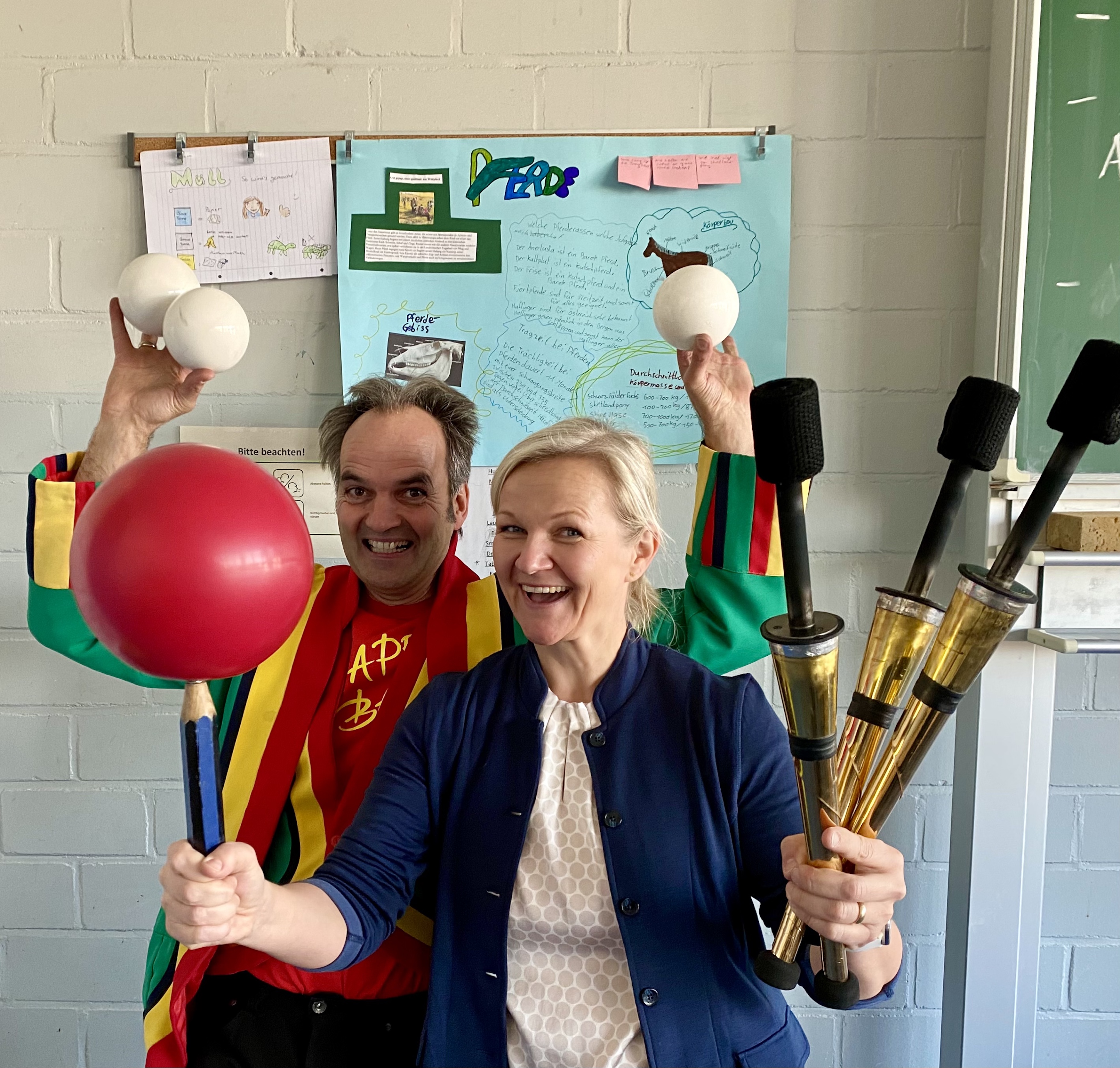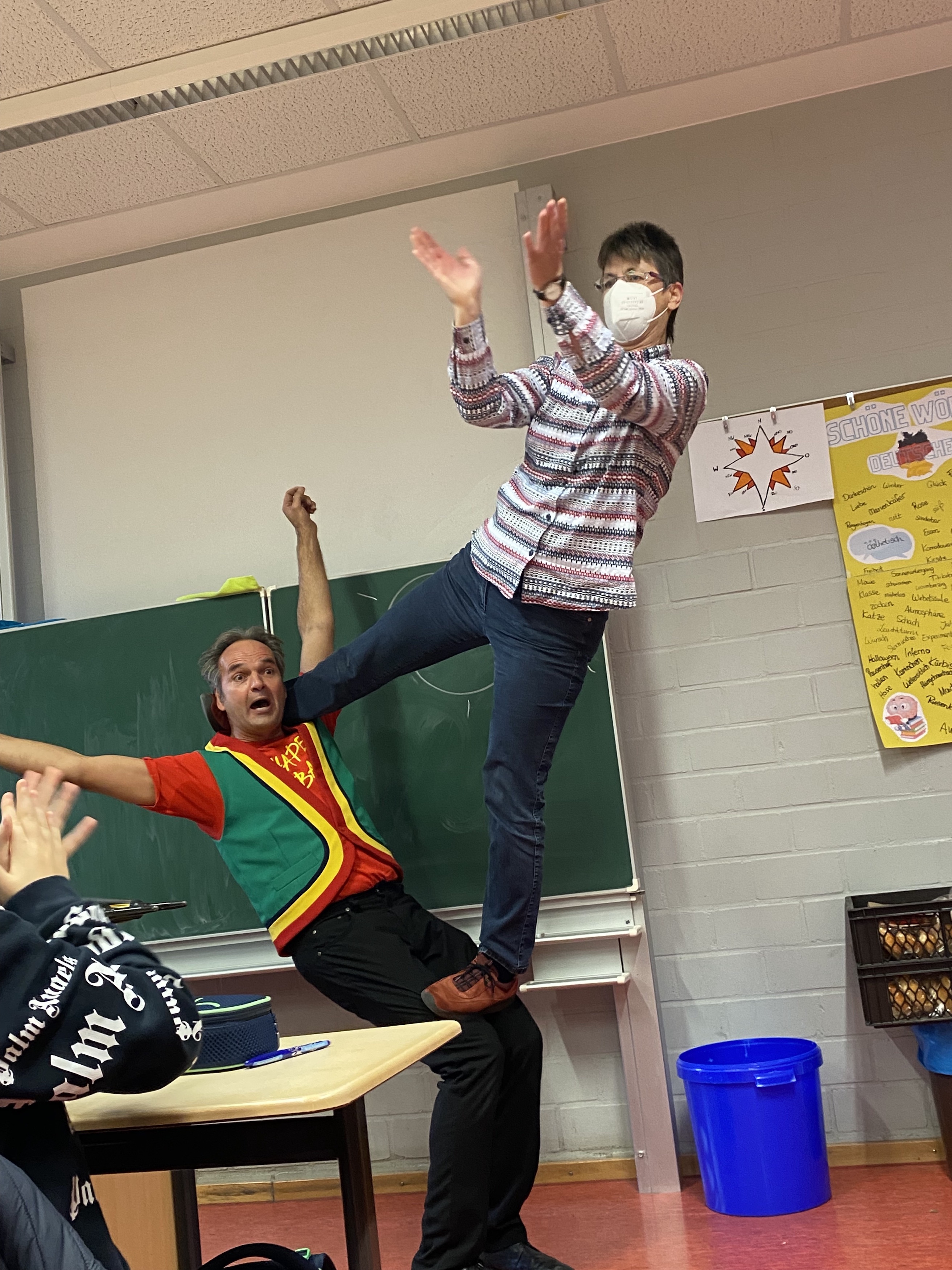 Gerhard Leßmann - professioneller Artist und Zauberkünstler - jonglierte unter der Mitwirkung der Klassenlehrerinnen und -lehrer auf so beeindruckende Weise, dass so manchem Schüler die Luft wegblieb. "Das war cool!", kam es aus den Reihen der Schülerinnen und Schüler, die den Auftritt mit großem Applaus begleiteten.