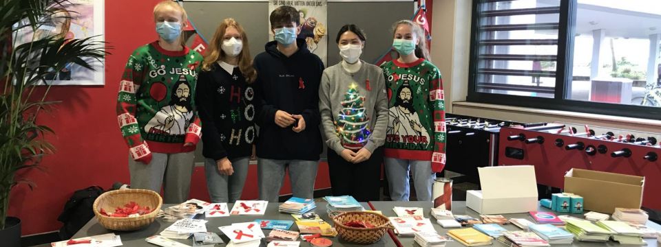 Traditionell begehen wir den 1. Dezember am Adolfinum mit einer Tombola zum Welt AIDS Tag. Da im Jahr 2020 aber alles anders ist und Hygieneregeln und Abstandhalten bei einer Tombola nicht immer eingehalten werden können, gab es in diesem Jahr für die 9. Klassen ein kleines Paket mit Informationsmaterialien, das die Biologielehrerinnen und Biologielehrer netterweise im Anschluss an das Thema Viren im Unterricht verteilten. Zudem wurde in der Pausenhalle ein Informationsstand von der Klasse 9e betreut.
