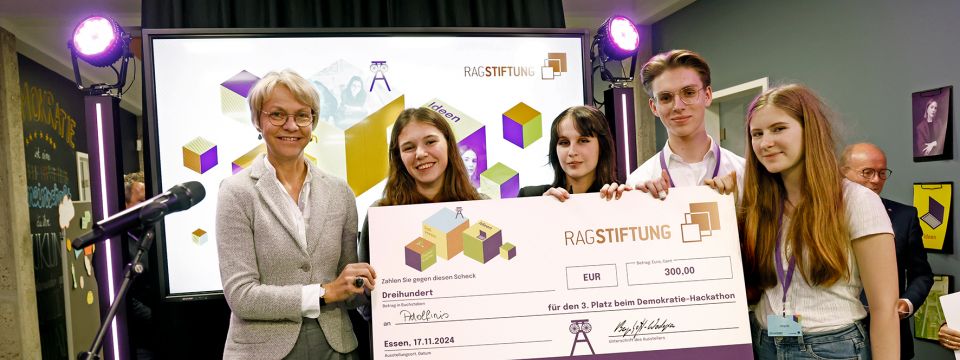 Am Wochenende des 16. und 17. Novembers hieß es für 8 Schülerinnen und Schüler des Adolfinums in 2 Teams á 4 Personen, darunter das Team „Adolfinis“, bestehend aus Timo Bartels, Joyce Weber, Leonie Schleicher und Coralie Salenga (alle Eph), früh aufstehen und den Weg zum Gelände der Zeche Zollverein antreten. Denn dort fand an diesem Wochenende der sogenannte „Hackathon #UnserReWIR“ als von der RAG-Stiftung ausgerufener Wettbewerb statt, bei dem die Aufgabe lautete, als Team ein Projekt zu entwickeln, das die Demokratie in der Heimatstadt, dem Ruhrgebiet oder ganz NRW stärken sollte.