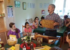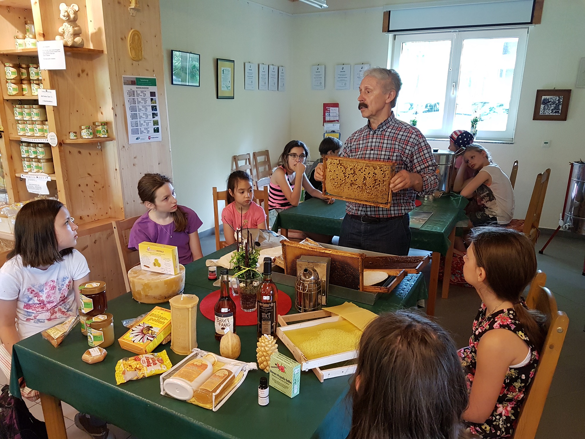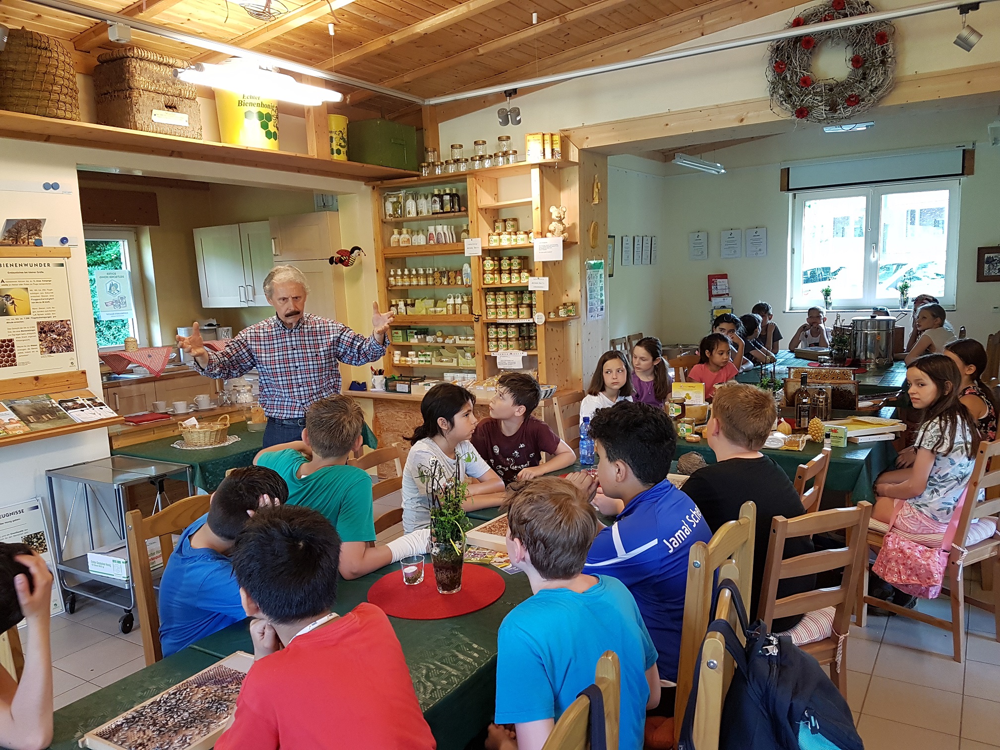 Nach 14 km waren wir endlich da. Am Bienenhaus haben wir erfahren, dass Bienen sehr schlaue Tiere sind und wir konnten Bienenprodukte kaufen. Wir haben gelernt, dass die Bienen tanzen, um miteinander zu kommunizieren. Als wir vor dem Bienenstock standen, haben wir die Königin des Bienenvolkes gesehen und am Ende haben wir Honigbrote gegessen.
