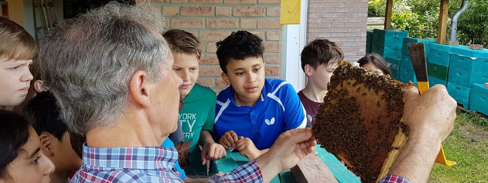 Die Wabe im Blick: Heinz Engels erklärt der 5c den Stockaufbau.