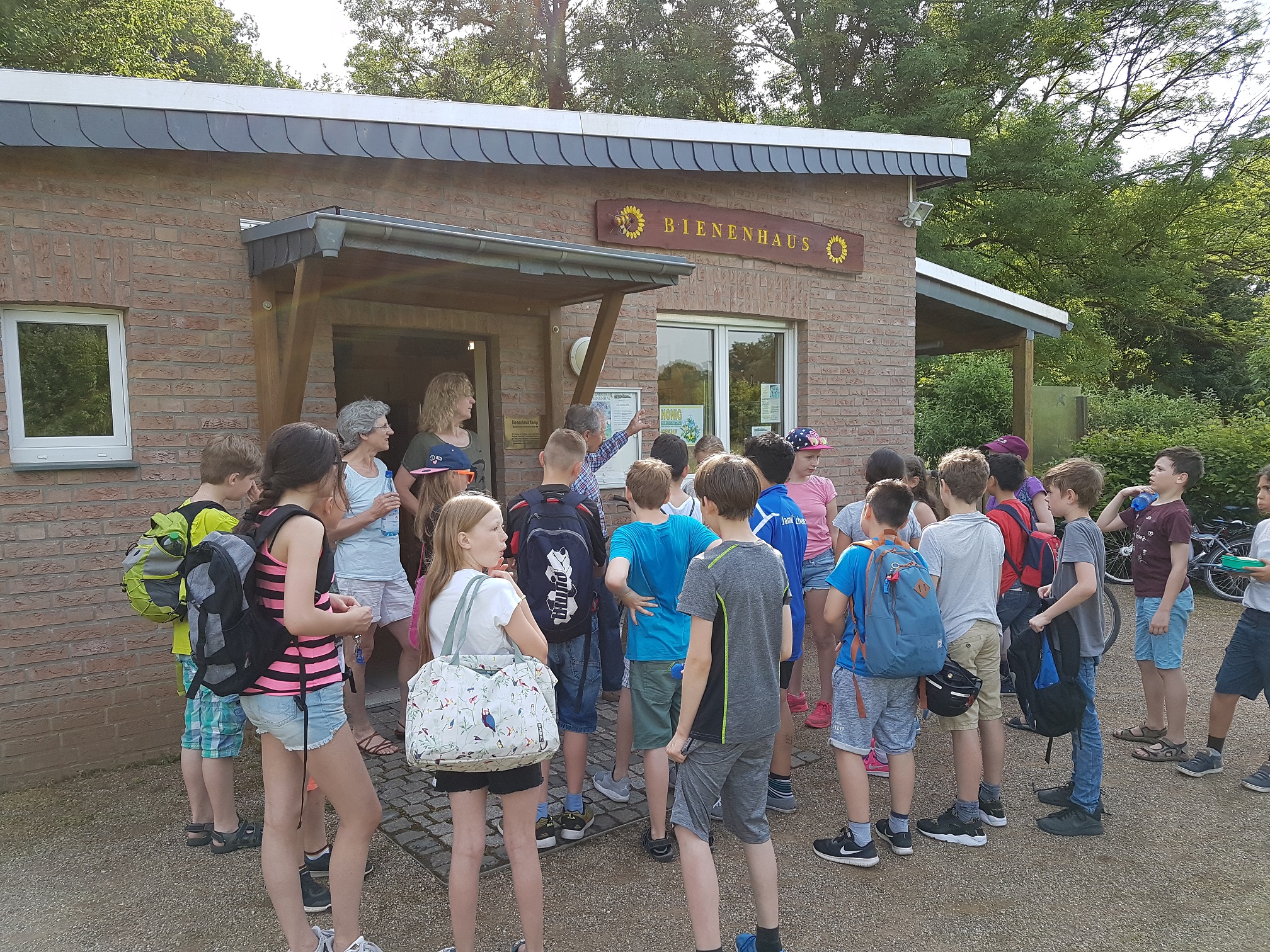 Abgerundet wurde das Projekt durch eine Exkursion ins Bienenhaus am Kloster Kamp am 29. Mai. Nach einer zweistündigen Fahrradtour bei strahlendem Sonnenschein empfingen uns dort unsere ehemalige Lehrerin Christel Lietzow und der Imker Heinz Engels. Nach einem kurzen Vortrag zur Lebensweise und Nutzung der Biene führten uns die beiden Experten zu den Bienenstöcken. Dort konnten unsere Schülerinnen und Schüler hautnah die Haltung von Bienen beobachten und Fragen an unsere beiden Guides richten. Unsere Klasse zeigte sich sichtlich begeistert. An dieser Stelle noch einmal ein herzliches Dankeschön an Christel Lietzow und Heinz Engels.