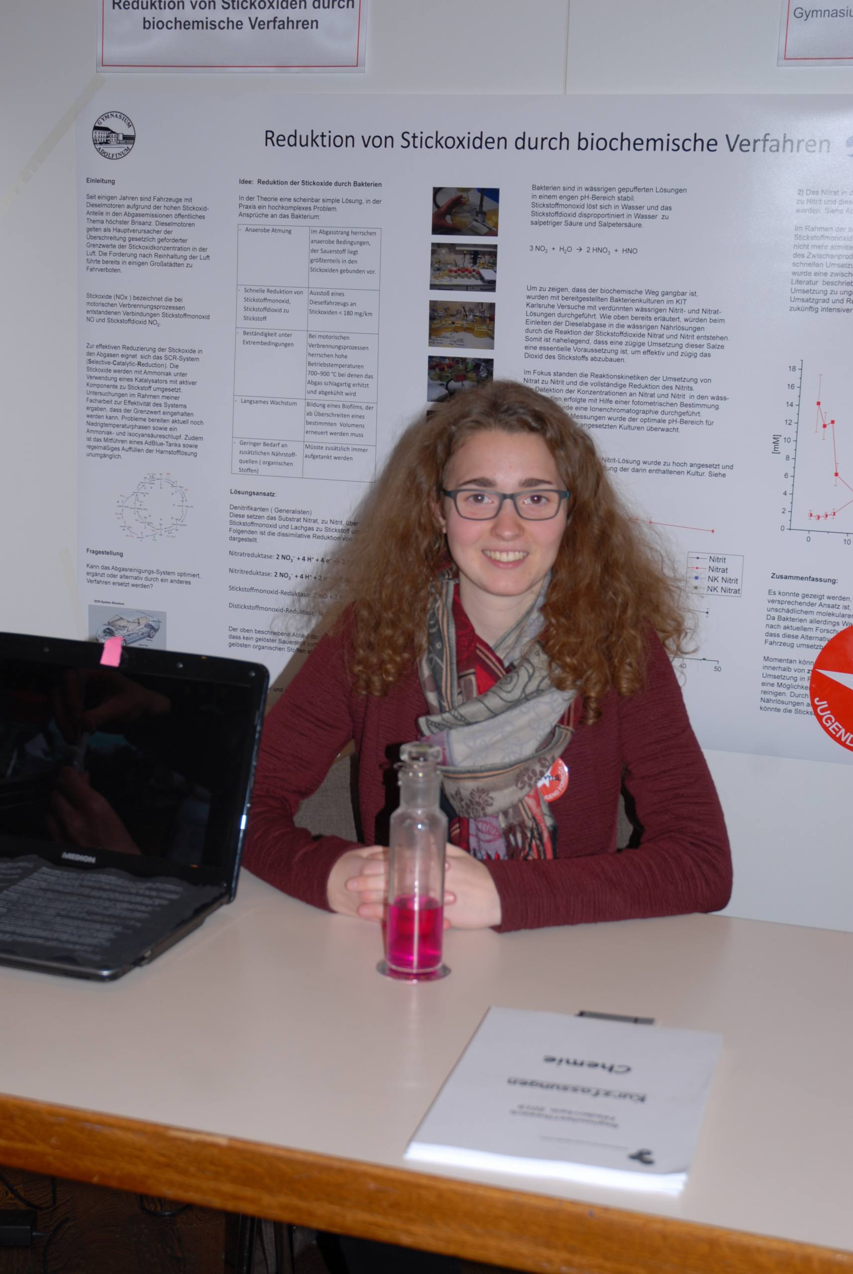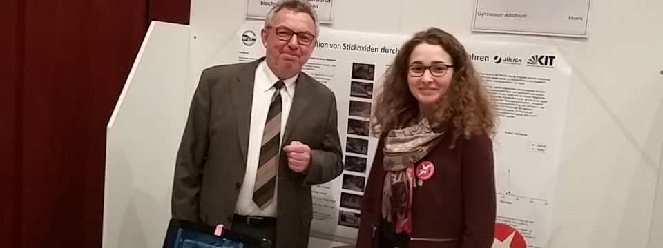 Anna Karl gewann im Fachbereich Biologie mit einem Projekt zur Reduktion von Stickoxiden durch biochemische Verfahren; sie darf im April beim Landeswettbewerb starten. Ein zweiter Preis ging an Dominik Bux im Fachbereich Physik, der sich mit der Optimierung eines Mikrowellenherdes beschäftigt hat. Neben den beiden Preisträgern präsentierte auch Antonia Schindelmann in Krefeld die Ergebnisse ihrer Arbeit, die sich mit der Frage beschäftigte, ob die Nutzung von Desinfektionsmitteln im Alltag sinnvoll ist.