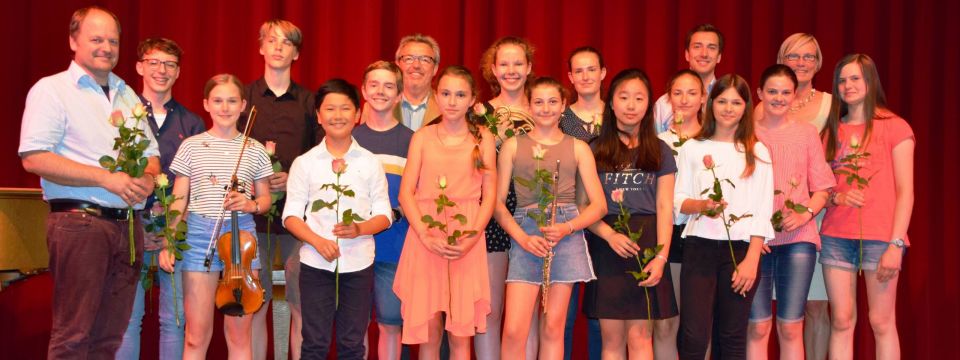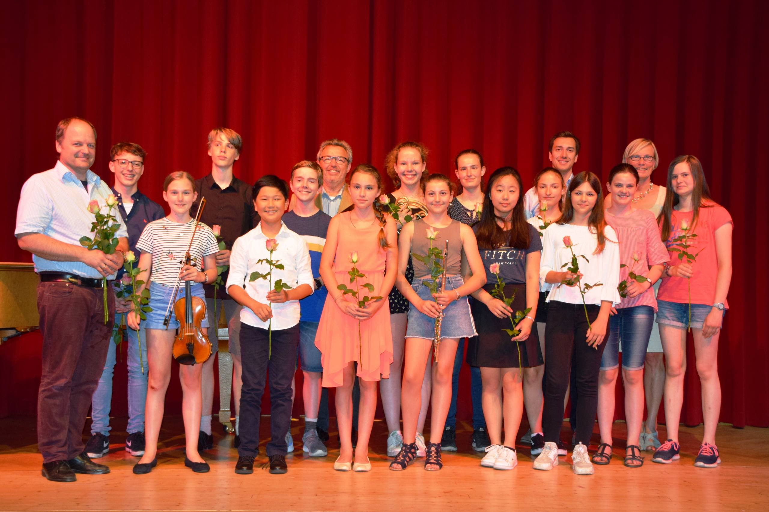 Auf dem "Podium Adolfinum" (von links): Musiklehrer Jörg Meschendörfer, Niklas Klag, Emma von Groeling-Müller, Falk van den Bosch, Eric Long, Mats Schröder, Schulleiter Hans van Stephoudt, Anna Malyschew, Leonie Kramer, Paula Schmitz, Katha Lerner, Luise Lu, Sarah Lerner, Musiklehrer Simon Stockamp, Nele Scherer, Hanna Weiß, Musiklehrerin Cordelia Rahrbach-Sander, Jennifer Bux.