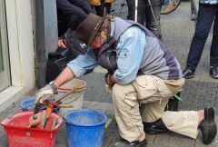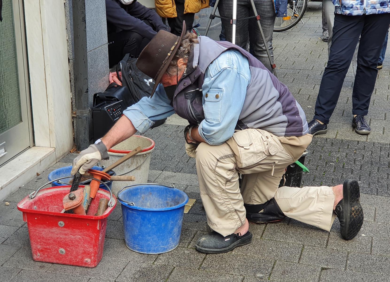 Trotz seines fortgeschrittenen Alters führt der Künstler die Verlegungen immer noch selbst durch. Es war spannend Gunter Deming bei der Verlegung der „Stolpersteine“ zuzuschauen, die er mit großer Hingabe und Sorgfalt durchführte. Nach der Verlegung hatten wir die Gelegenheit, ein kurzes Gespräch mit ihm selbst zu führen. Laut eigener Aussage kommt er immer sehr gerne nach Moers. Weiterhin mache er das sehr gerne für uns und wünscht sich, das Projekt auch in Zukunft weiterzuführen.