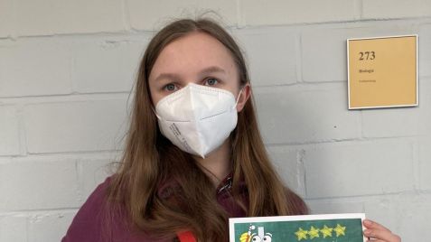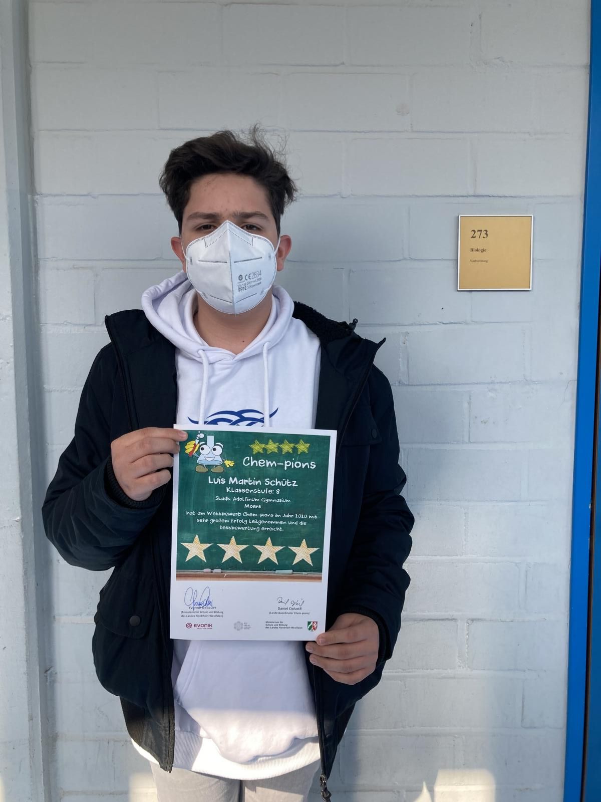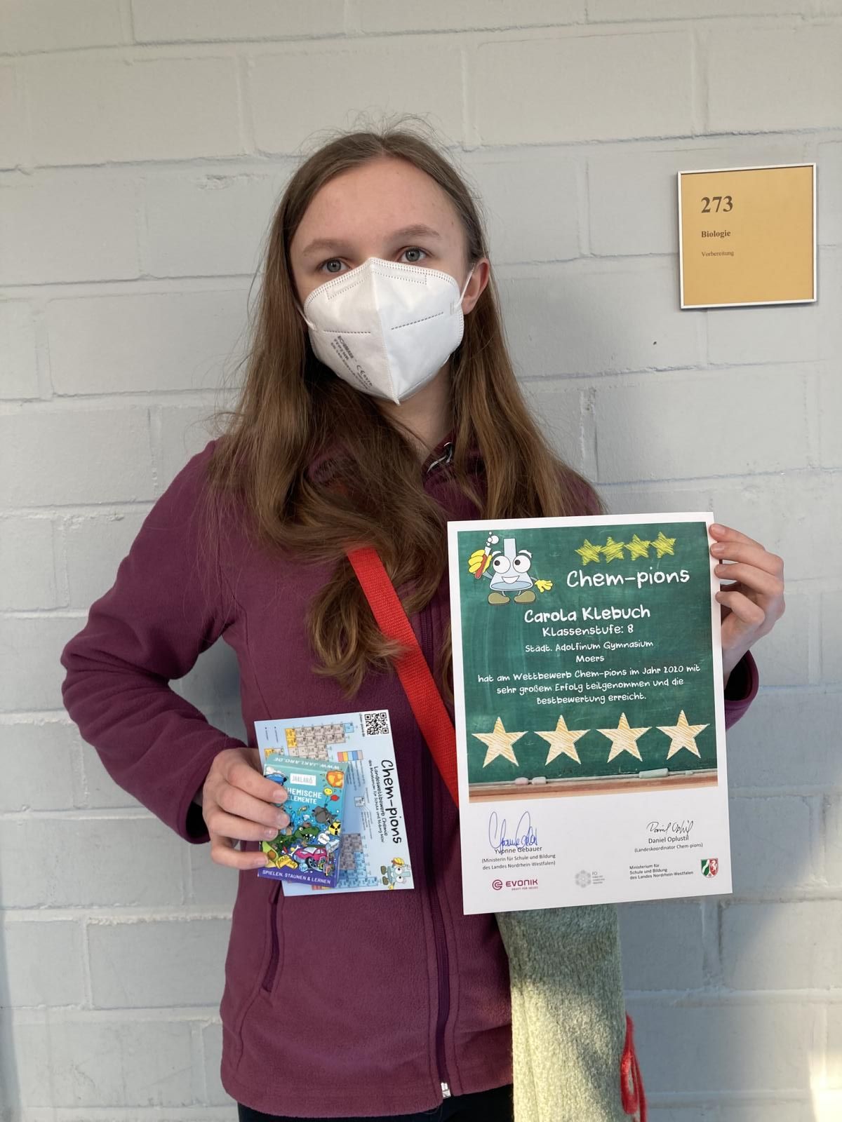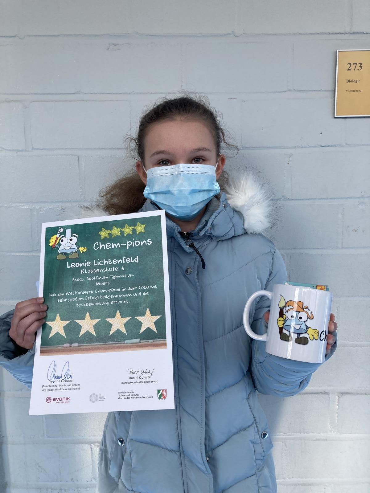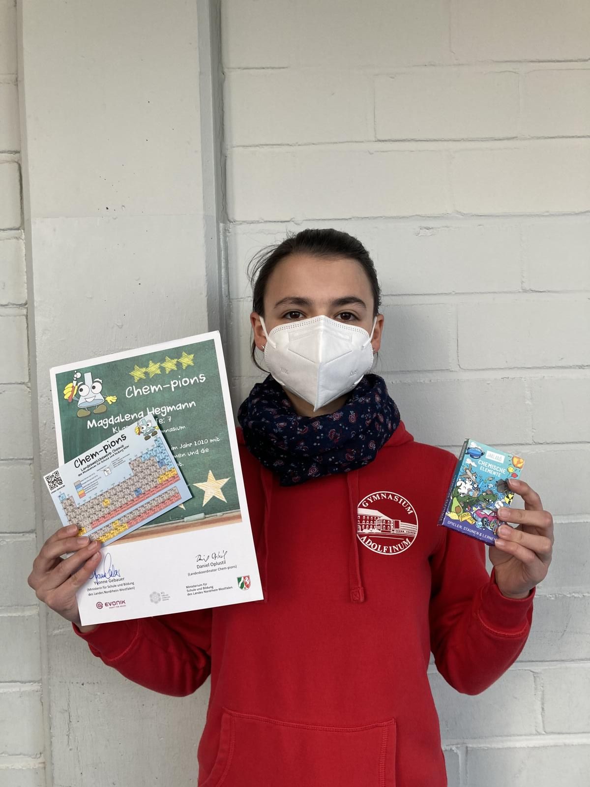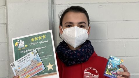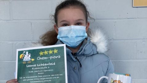 Alle Teilnehmenden erhalten nach Bewertung ihrer Arbeiten eine Urkunde. Die erfolgreichsten Teilnehmer: innen sind die sogenannten 4-Sterne Chem-pions, dazu zählten am Adolfinum: Leonie Lichtenfeld (6c), Magdalena Hegmann (7d) Carola Klebuch (8e) und Luis Martin Schütz (8e). Sie erhielten Sachpreise und wurden zu einer virtuellen Abschlussveranstaltung (am 16.04.21) eingeladen.