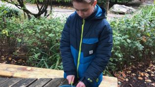Die Schülerinnen und Schüler wurden von Christine Peter, der Leiterin dieses Tages, um 9 Uhr am Eingang im Empfang genommen und durch den Zoo zu einem umgebauten Anhänger geführt. Dort galt es, Beschäftigungsspielzeug für die Menschenaffen des Zoos herzustellen, denn, so lernten die Schülerinnen und Schüler, langweilen sich Menschenaffen sehr schnell, da sie in natürlicher Umgebung eigentlich ständig auf Nahrungssuche wären.