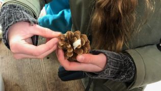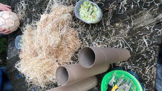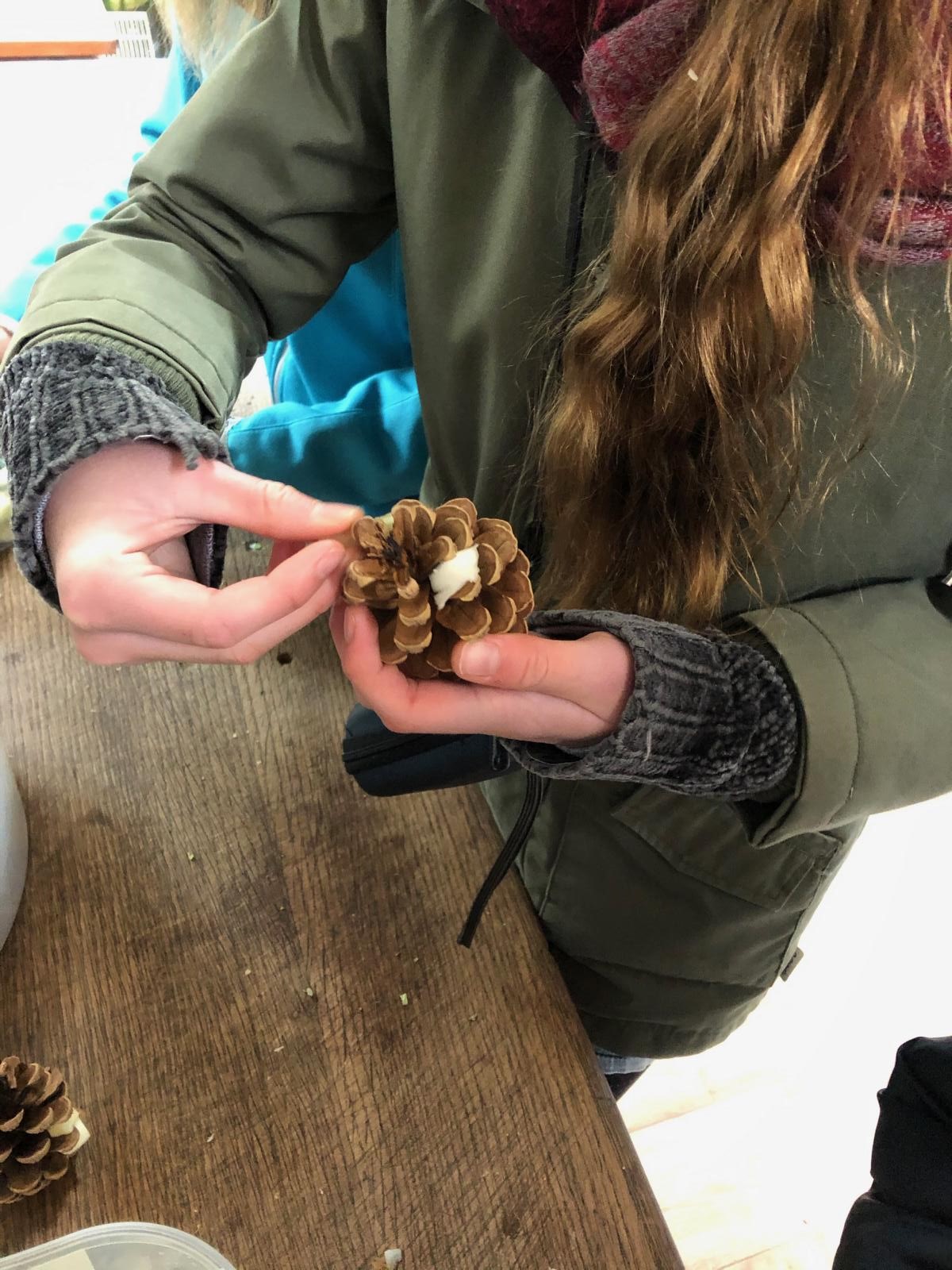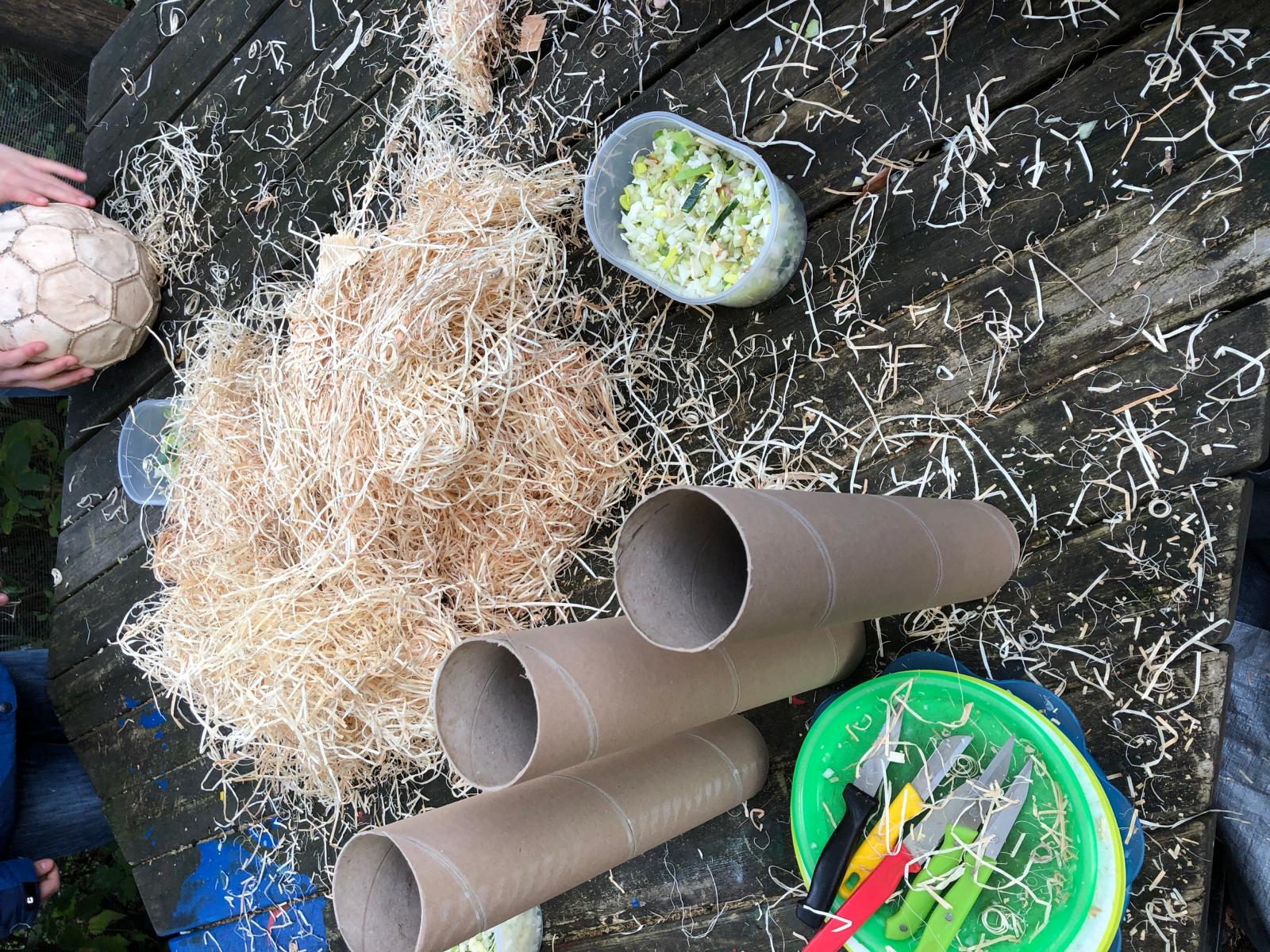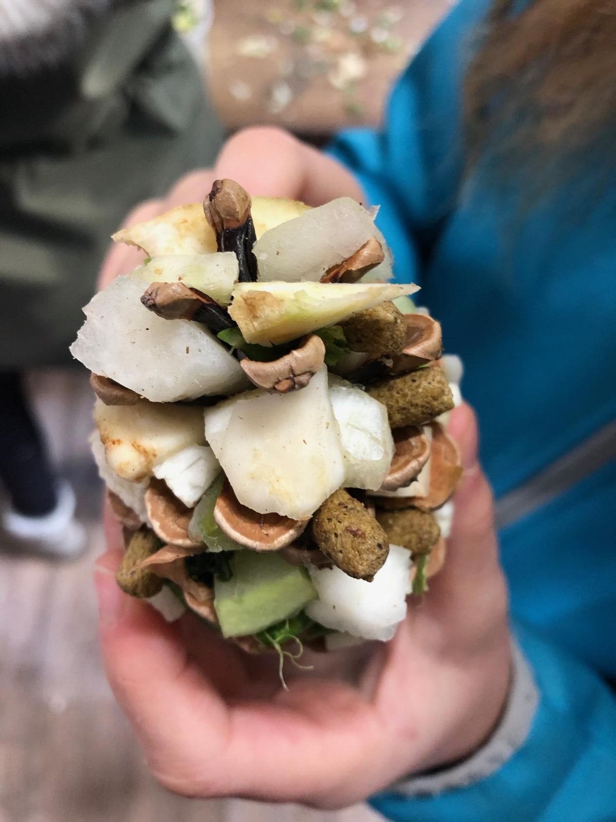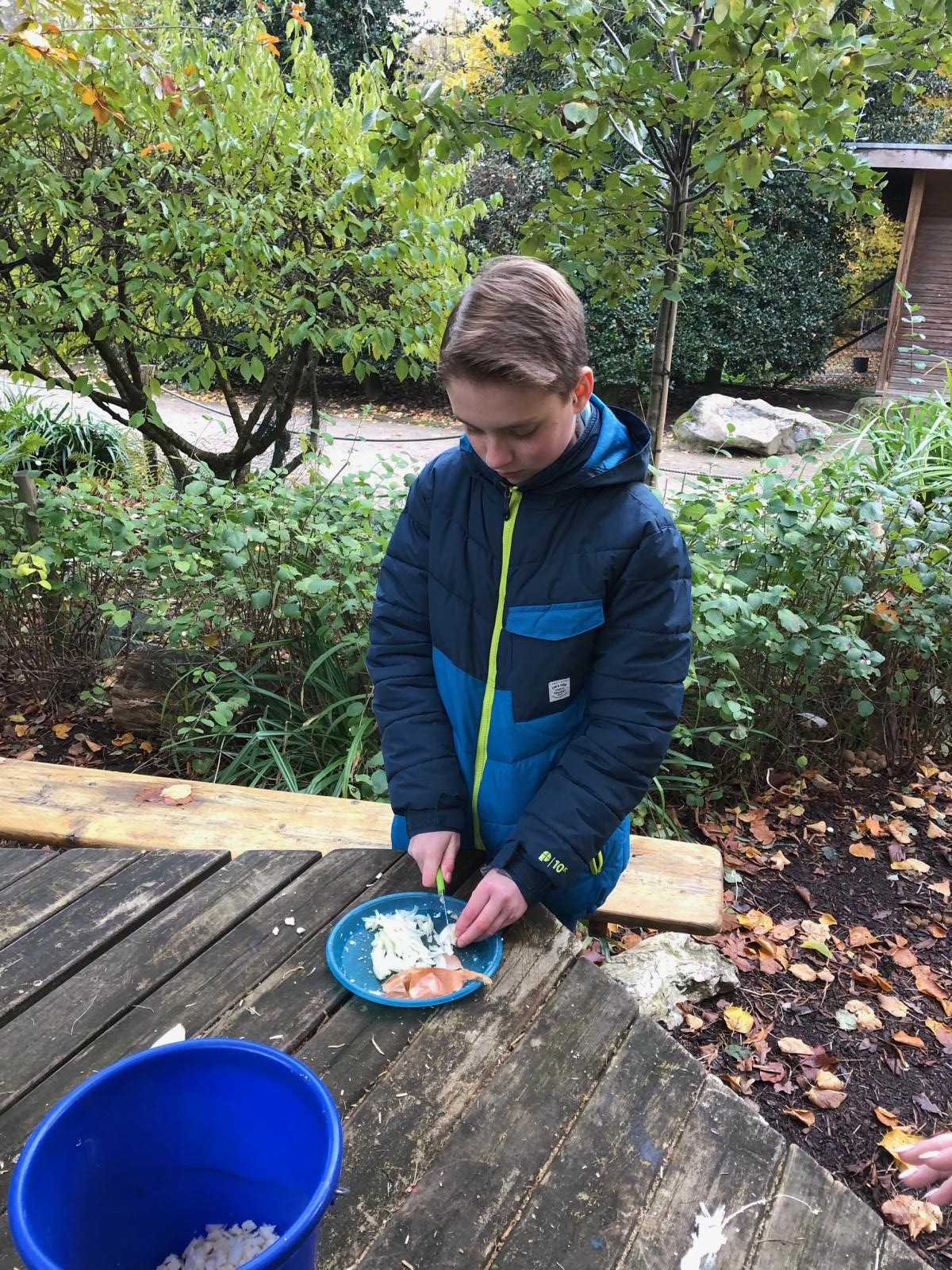 Nach einer kurzen Anleitung ging es auch schon los: Fußbälle, Papierrollen und sogar Tannenzapfen wurden mit zuvor kleingeschnittenem Gemüse und Futterpellets gefüllt. Unsere drei Adolfiner*innen waren unerschrocken und probierten sogar ein Futterpellet. Es schmeckte nach Hafer und getrocknetem Gemüse. Alle empfanden den Snack für die Affen als durchaus lecker.