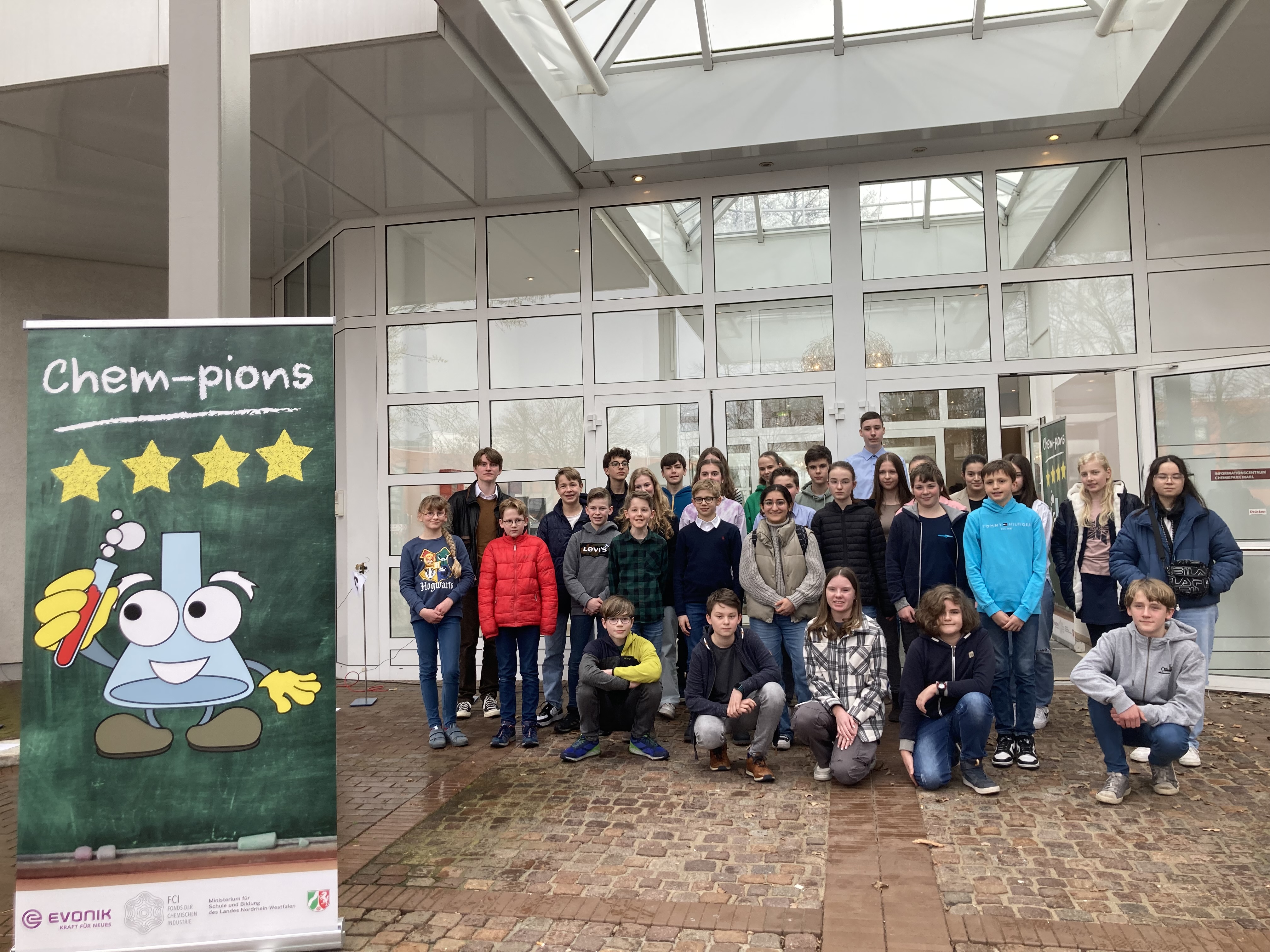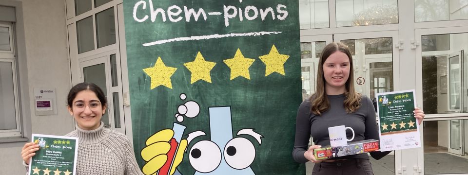 Mira Rashid und Lilien Behrens (beide aus der Jahrgangsstufe 8) haben beim diesjährigen Wettbewerb "Chem-pions" - dem Landeswettbewerb Chemie des NRW-Schulministeriums - eine herausragende Leistung erzielt: Sie gehören als „4-Sterne Chem-pions“ zu den erfolgreichsten Teilnehmerinnen und Teilnehmern der Wettbewerbs. Beide wurden durch ein Grußwort von NRW-Schulministerin Dorothee Feller, einem kurzweiligen Experimentalvortrag und einer würdevollen Preisverleihung durch VertreterInnen des Ministeriums und einem abschließenden Buffet gebührend gefeiert.