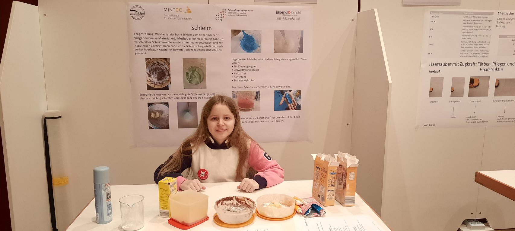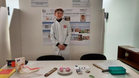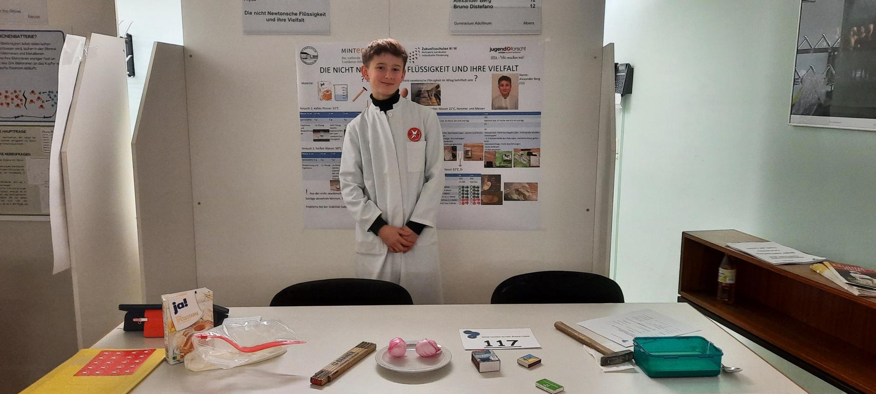 Alexander Berg aus der 7a startete mit dem Projekt „Die nicht Newtonsche Flüssigkeit und ihre Vielfalt“ im Fachbereich Physik und erhielt neben dem Sonderpreis für Kreativität in der Physik auch den Regionalsieg und tritt am 4. Mai mit seinem Projekt auf Landesebene an.