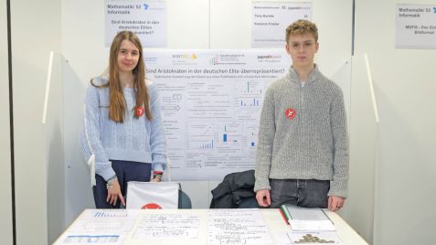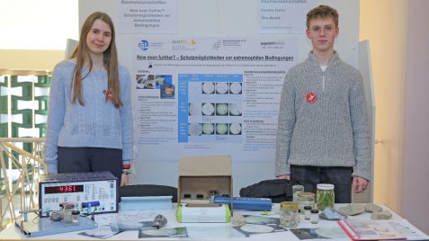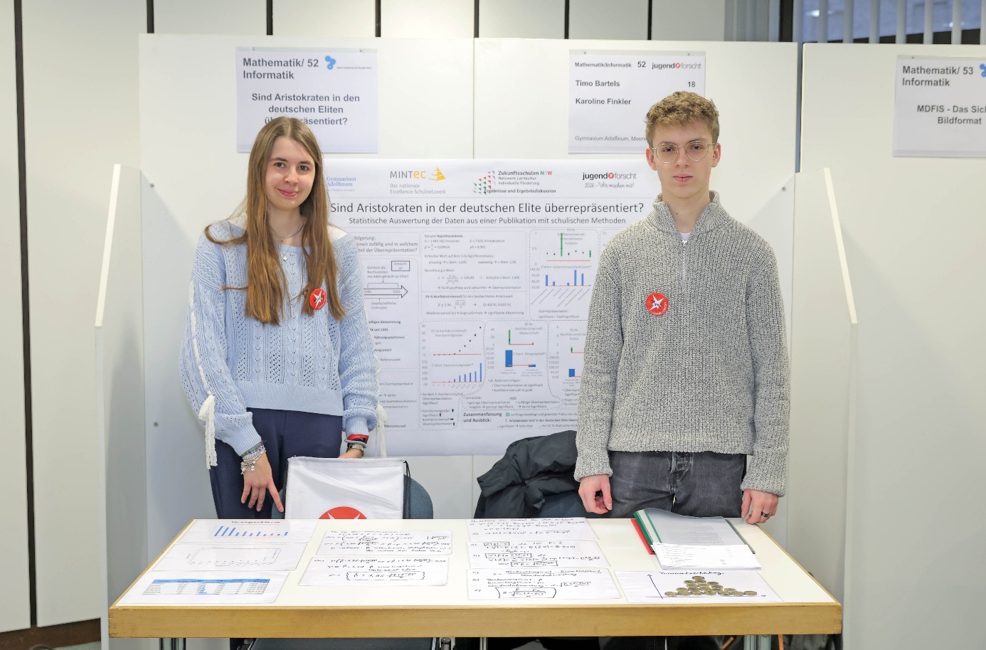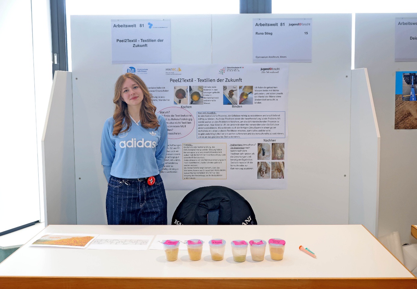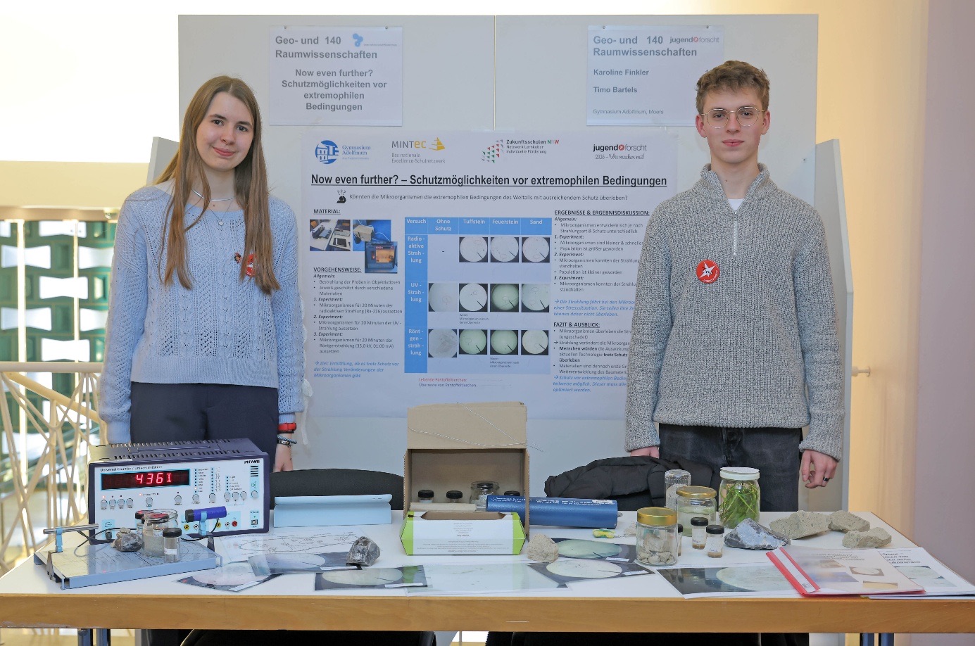 Auch in der Sparte „Jugend forscht“ war das Adolfinum sehr erfolgreich vertreten. Karoline Finkler und Timo Bartels wurden im Fachgebiet Geo- und Raumwissenschaften für ihre Arbeit „Now even further? – Schutzmöglichkeiten vor extremophilen Bedingungen“ mit dem ersten Preis ausgezeichnet und nehmen als Regionalsieger am Landeswettbewerb in Bochum teil. Darüber hinaus erreichten sie im Fachbereich Mathematik/Informatik mit ihrer Studie „Sind Aristokraten in den deutschen Eliten überrepräsentiert?“ einen dritten Platz. Einen besonderen Erfolg erzielte Runa Stieg, die für ihr Projekt „Peel2Textil – Textilien der Zukunft“ mit dem Sonderpreis „Ressourceneffizienz und Zirkularität“ des Bundesministeriums für Umwelt, Naturschutz und nukleare Sicherheit ausgezeichnet wurde.