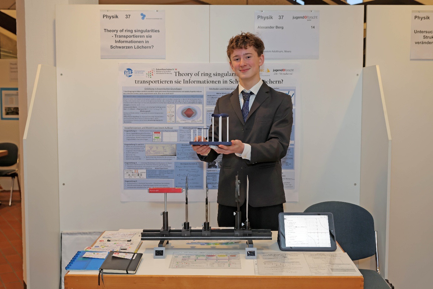 In der Alterssparte „Jugend forscht junior“ konnte insbesondere Alexander Berg überzeugen: Mit seiner Arbeit „Theory of ring singularities – transportieren sie Informationen in Schwarzen Löchern?“ gewann er im Fachgebiet Physik den ersten Preis, wurde Regionalsieger und qualifizierte sich damit für die nächste Wettbewerbsrunde in Essen. Ebenfalls erfolgreich war Paula Gies, die im Fachgebiet Chemie mit ihrer Untersuchung zur Wirksamkeit verschiedener Fleckenentferner einen zweiten Preis erzielte. Einen dritten Preis im Fachgebiet Physik erhielt Philip Linden für seine Forschung zur Strukturbildung von Ferrofluiden in veränderlichen Magnetfeldern.