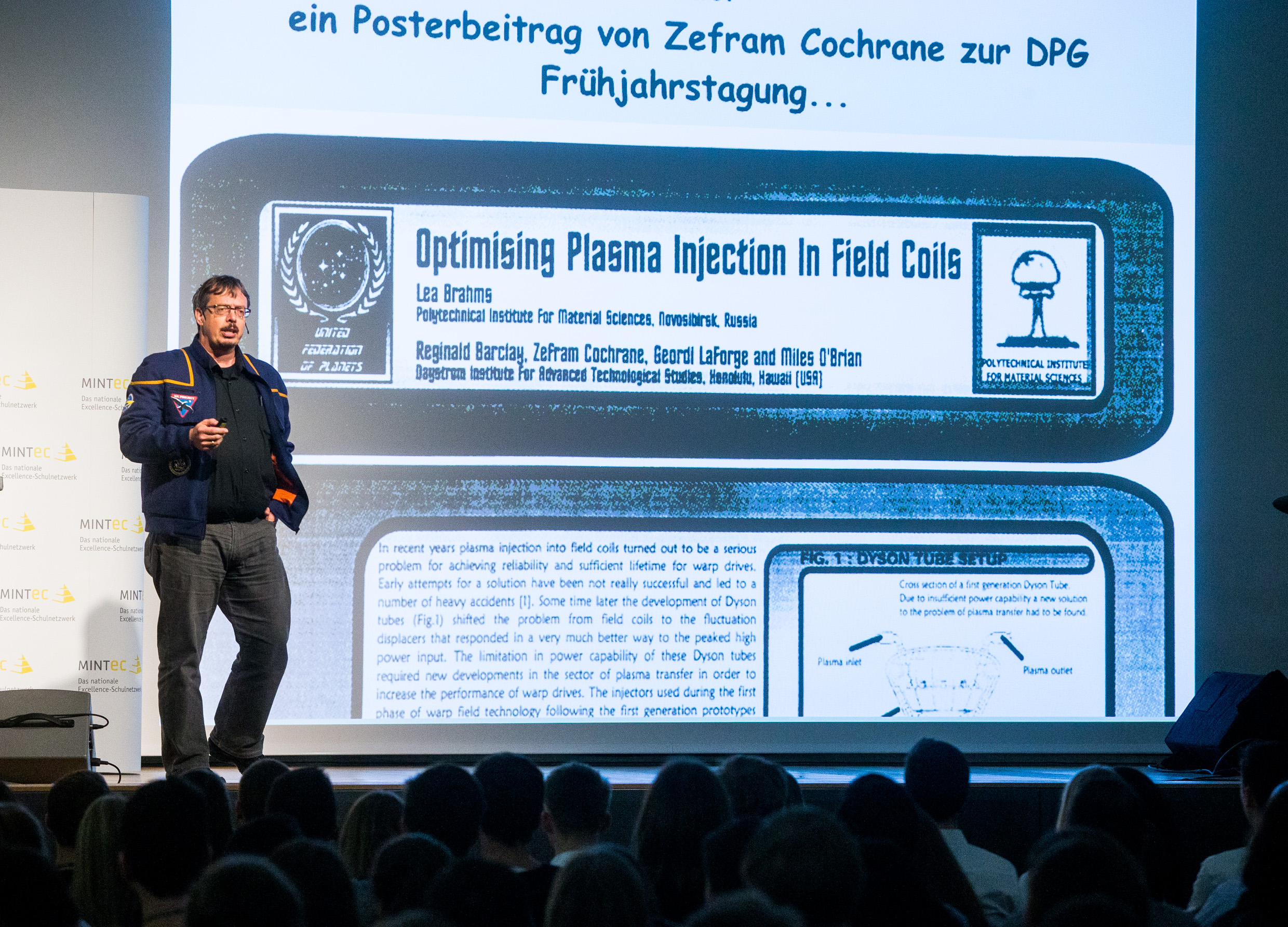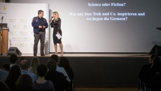 Am Abend trafen wir uns wieder mit allen Schülerinnen und Schülern zu einen Abschluss der Veranstaltung. Interessant war dabei vor allem der Vortrag von Prof. Markus Roth zum Thema „Science oder Fiction? Wie inspirieren uns StarTrek und Co. und wo liegen die Grenzen?“, in dem er uns die technischen Möglichkeiten von heute darstellte und sie mit den von StarTrek gezeigten Innovationen verglich. Er stellte uns komplexe physikalische Vorgänge sehr einfach und auf eine sehr unterhaltsame Weise dar.