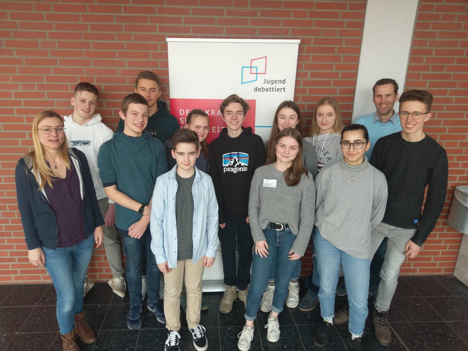 Große Delegation für eine wichtige Sache: Zwölf Adolfiner fuhren mit zwei Politiklehrern zum politischen Wettbewerb "Jugend debattiert".