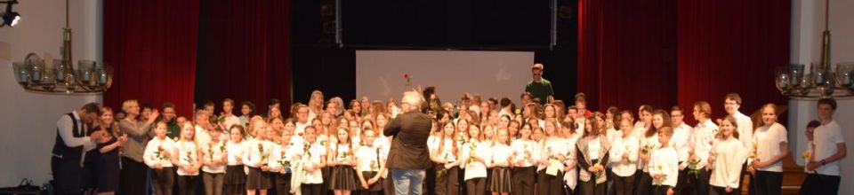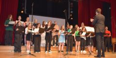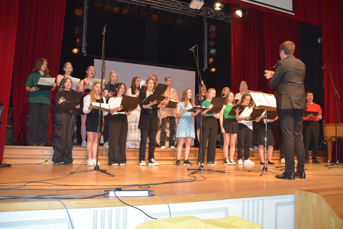 Das mit Abstand größte Ensemble des Adolfinums ist der Unter- und Mittelstufenchor, in dem über vierzig junge Sängerinnen und auch einige wenige Sänger gekonnt aktuelle Popmusik wie Set fire to the rain von Adele oder Cover me in sunshine von P!nk sowie die Titelmusik Vois sur ton chemin aus dem Film Die Kinder des Monsieur Mathieu aufführten. Abgelöst vom Mittel- und Oberstufenchor, der im Anschluss mit Billie Eilish’s neuem James-Bond-Titelsong No time to die und dem kurzweiligen Medley 4 Chords, bei dem sich kurze Ausschnitte aus verschiedensten Songs der letzten fünfzig Jahre in rasanter Geschwindigkeit abwechseln, die Bühne übernahm, mündete die erste Konzerthälfte in ein großes Finale, in der alle Mitwirkenden aus beiden Chören Happy von Bukahara darboten.