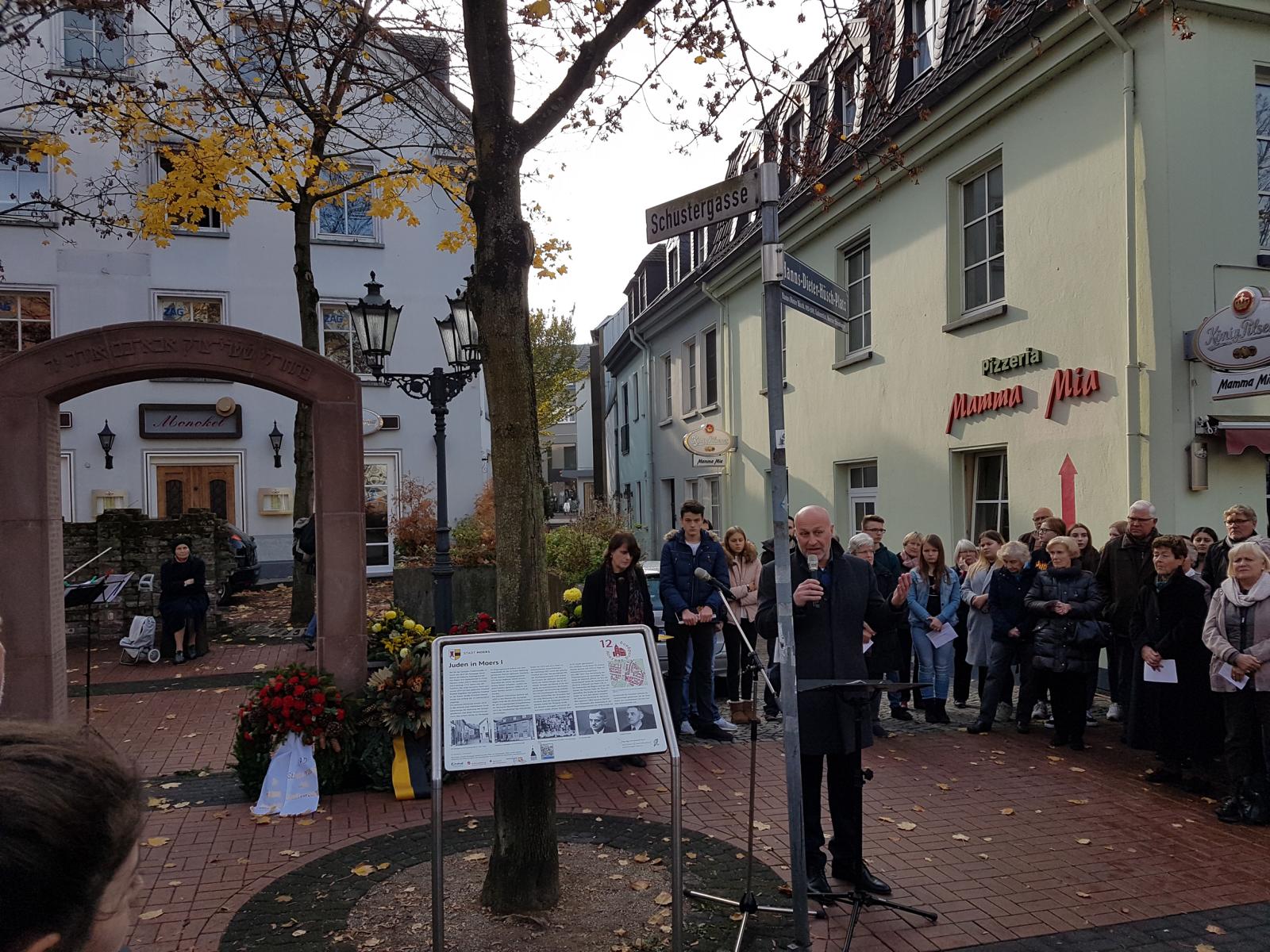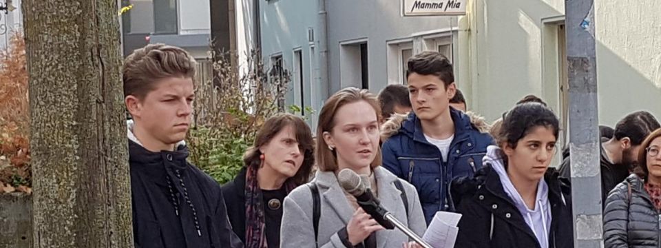 Von Schülerinnen und Schülern der Klasse 9c wurde ein Zeitzeugenbericht verlesen, in dem die Geschehnisse in der Reichspogromnacht vor 80 Jahren sowie die systematische Verfolgung jüdischer Mitbürgerinnen und Mitbürger geschildert wurde.