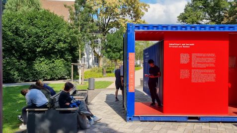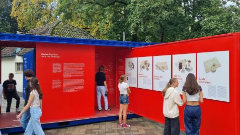 Tiefgehende Eindrücke: die Schülerinnen und Schüler beim Besuch der Ausstellung, die in einem zur Ausstellungsfläche umgebauten Übersee-Container gezeigt wird.