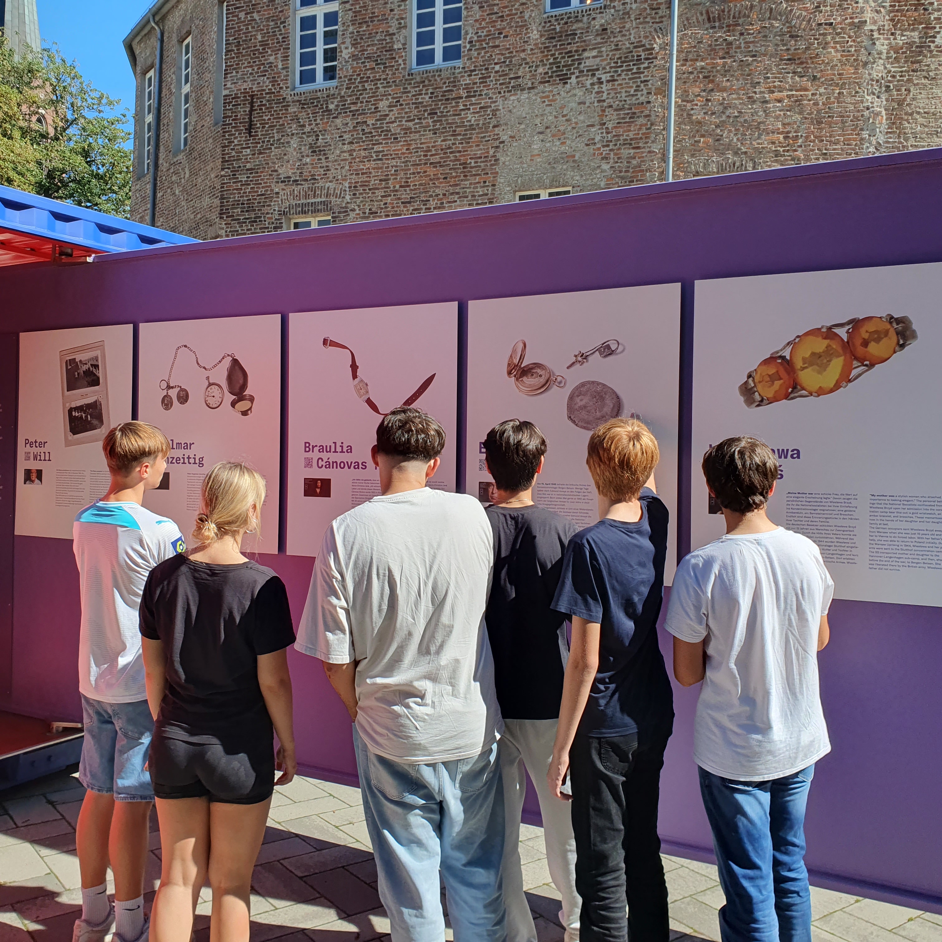 Unser Geschichtskurs hat am 30. August 2023 die Wanderausstellung #StolenMemory am Grafschafter Museum in Moers besucht. Im Mittelpunkt der Ausstellung stehen die Besitztümer von Menschen, die dem Nazi-Regime zum Opfer fielen. Die weltweite Initiative der Arolsen Archives bemüht sich darum, diese persönlichen Gegenstände an Angehörige zurückzugeben.