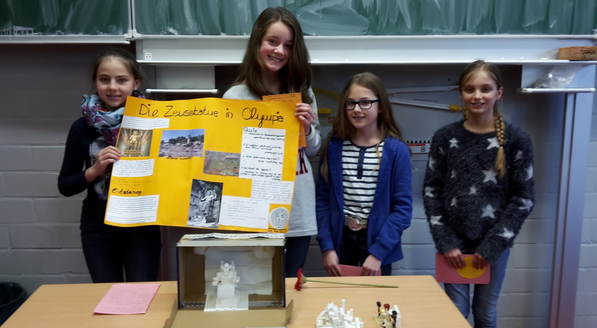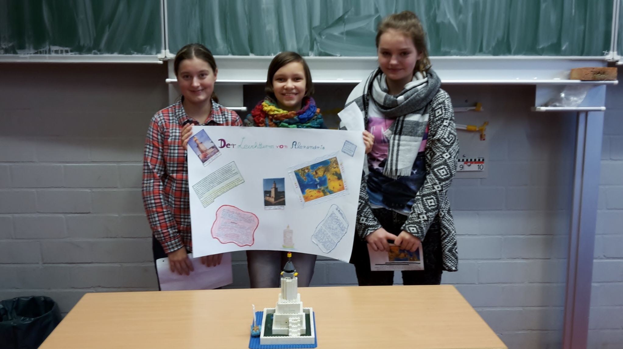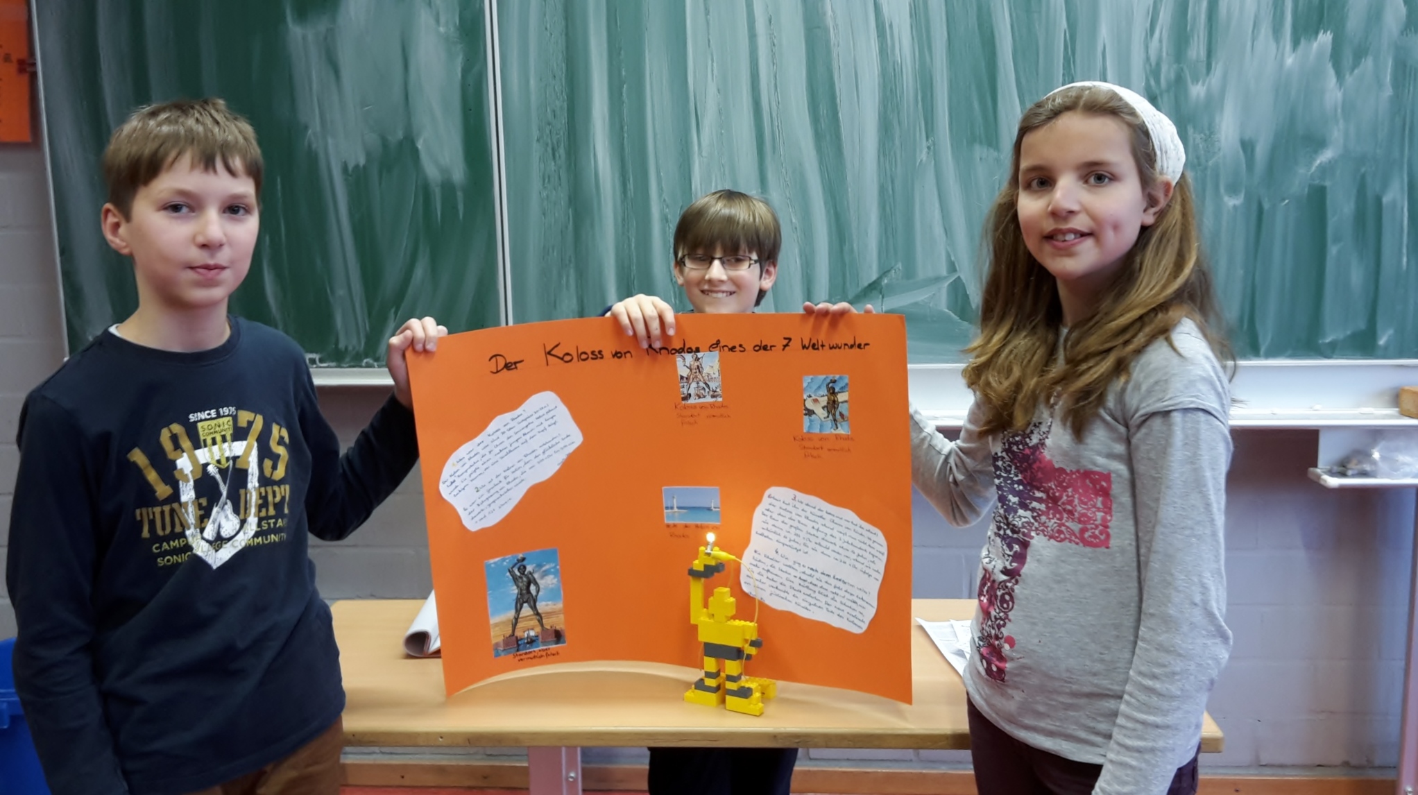 Das Grab von König Mausolos war mit Sicherheit das größte Modell und die hängenden Gärten bekamen gleich zwei Modelle. Der Leuchtturm von Alexandria und die Zeusstatue wurden aus Lego gebaut und die Pyramiden bekamen ein wunderbares Modell aus Pappe und Papier. Der Artemis Tempel, dessen erstes Modell misslang, wurde beim zweiten Mal geradezu perfekt und der Koloss von Rhodos wurde genial beleuchtet. Die Plakate waren sehr gut gestaltet und informierten über das jeweilige Weltwunder. Alles im allen war es eine tolle Idee von Frau Mecklenburg und ein riesen Erfolg.