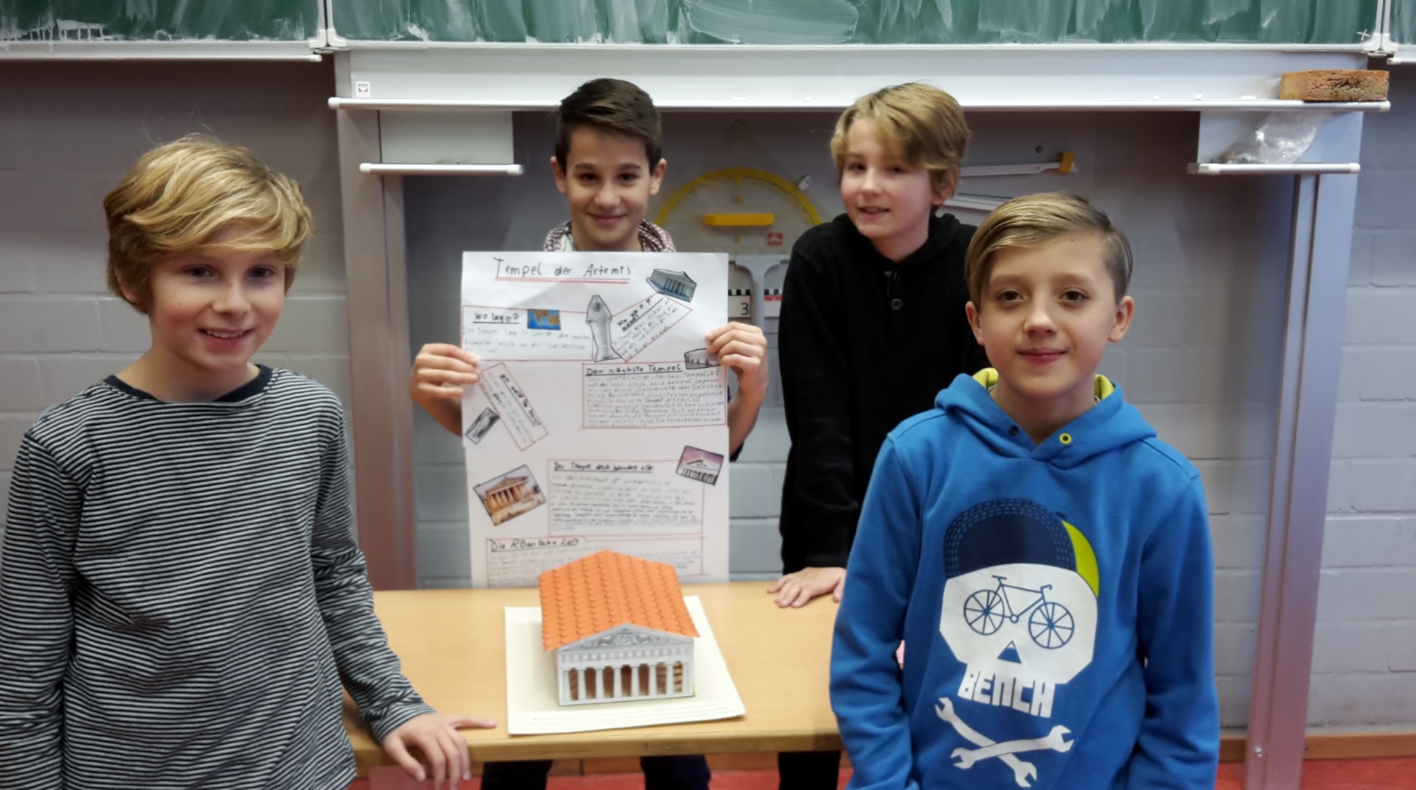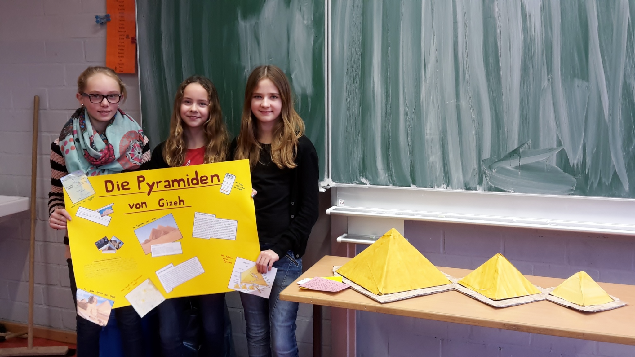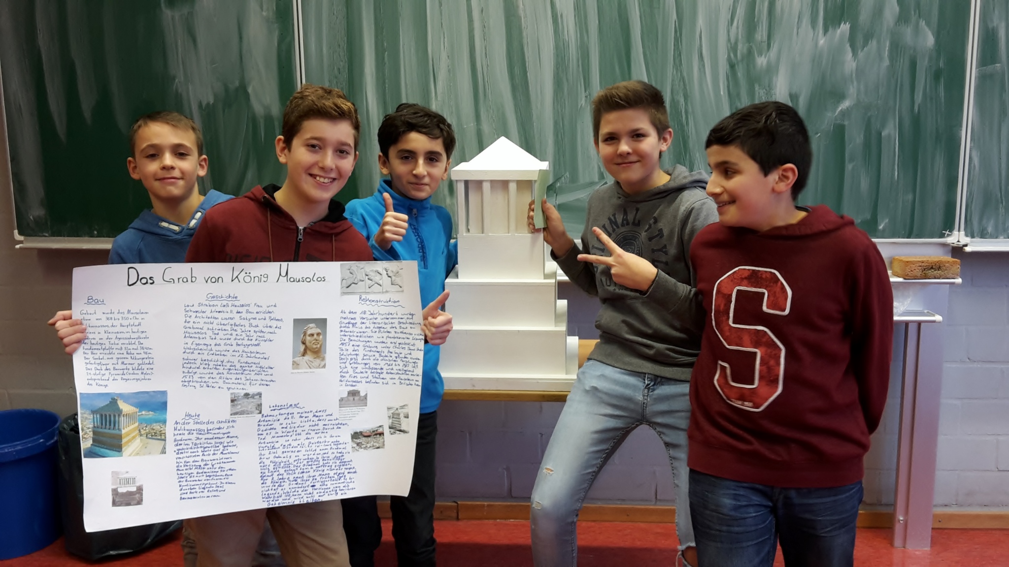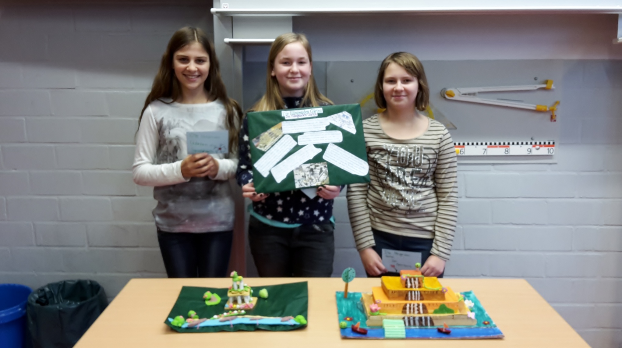 Das Grab von König Mausolos war mit Sicherheit das größte Modell und die hängenden Gärten bekamen gleich zwei Modelle. Der Leuchtturm von Alexandria und die Zeusstatue wurden aus Lego gebaut und die Pyramiden bekamen ein wunderbares Modell aus Pappe und Papier. Der Artemis Tempel, dessen erstes Modell misslang, wurde beim zweiten Mal geradezu perfekt und der Koloss von Rhodos wurde genial beleuchtet. Die Plakate waren sehr gut gestaltet und informierten über das jeweilige Weltwunder. Alles im allen war es eine tolle Idee von Frau Mecklenburg und ein riesen Erfolg.