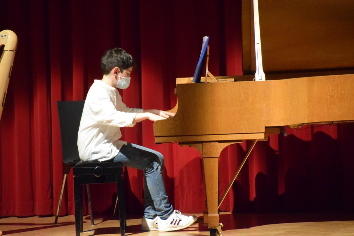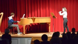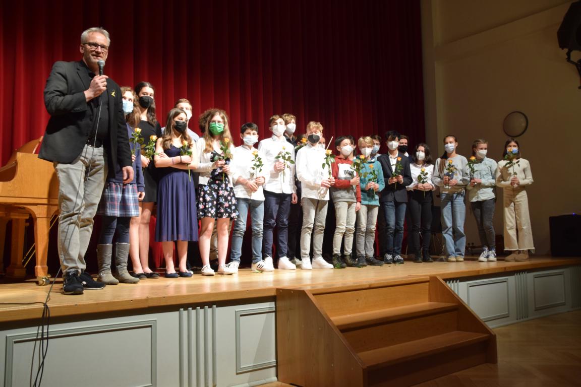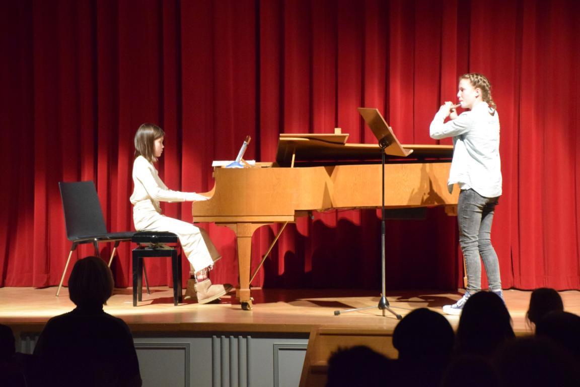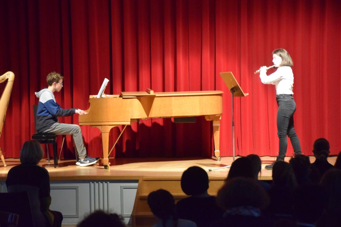 Zum Glück gab es auch kaum Absagen wegen Corona, nur der Beitrag der Percussiongruppe musste aus diesem Grund leider ausfallen. Dies ist umso trauriger, als Julius, der Komponist des Beitrags, in diesem Jahr Abitur macht. Auch für andere Schülerinnen und Schüler war es das letzte Konzert und somit der Abschied von einer langen musikalischen Laufbahn am Adolfinum: Zoe Vukovic am Cello, Anke Völker, Flöte und Emma von Groeling-Müller, Violine, letztere mit einem atemberaubenden Vortrag von Max Bruchs Violinkonzert, toll begleitet von Carolin Folkmar, werden uns allen noch lange in Erinnerung bleiben.