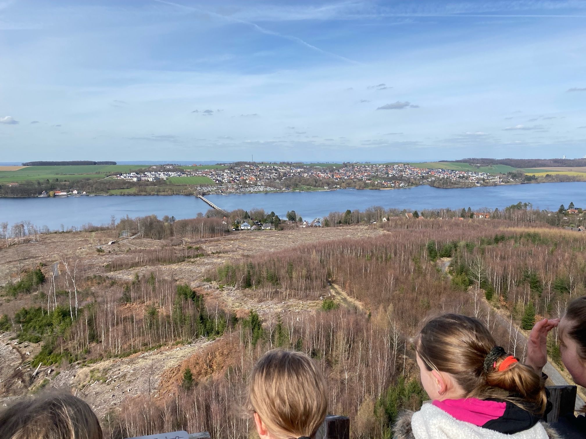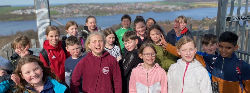 Die 5d sendet sonnige Grüße vom Möhnesee: Der erste Tag war kalt und wechselhaft, aber Nils, unser Teamer, hat uns mit tollen Teamspielen bei sehr guter Laune gehalten und für rosige Wangen und warme Füße gesorgt. Die Aussicht vom Möhnesee-Turm ist wunderschön, auch die GPS-Wanderung war toll. Gestern konnten wir Bogenschießen und Klettern, während andere Kinder im Wald Kugelbahnen aus Naturmaterialien gebastelt haben. Heute steht die Stadtrallye an. Das Essen ist lecker und die Zimmer gemütlich.