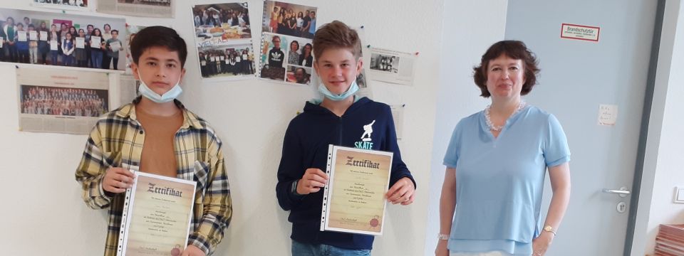 Ausgezeichnet: Jwan Moslem und Kirill Zimich mit Kursleiterin Dr. Babett Götz; die beiden Schüler haben den Modelltest A2 bestanden.