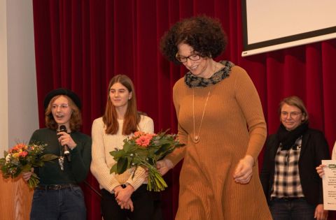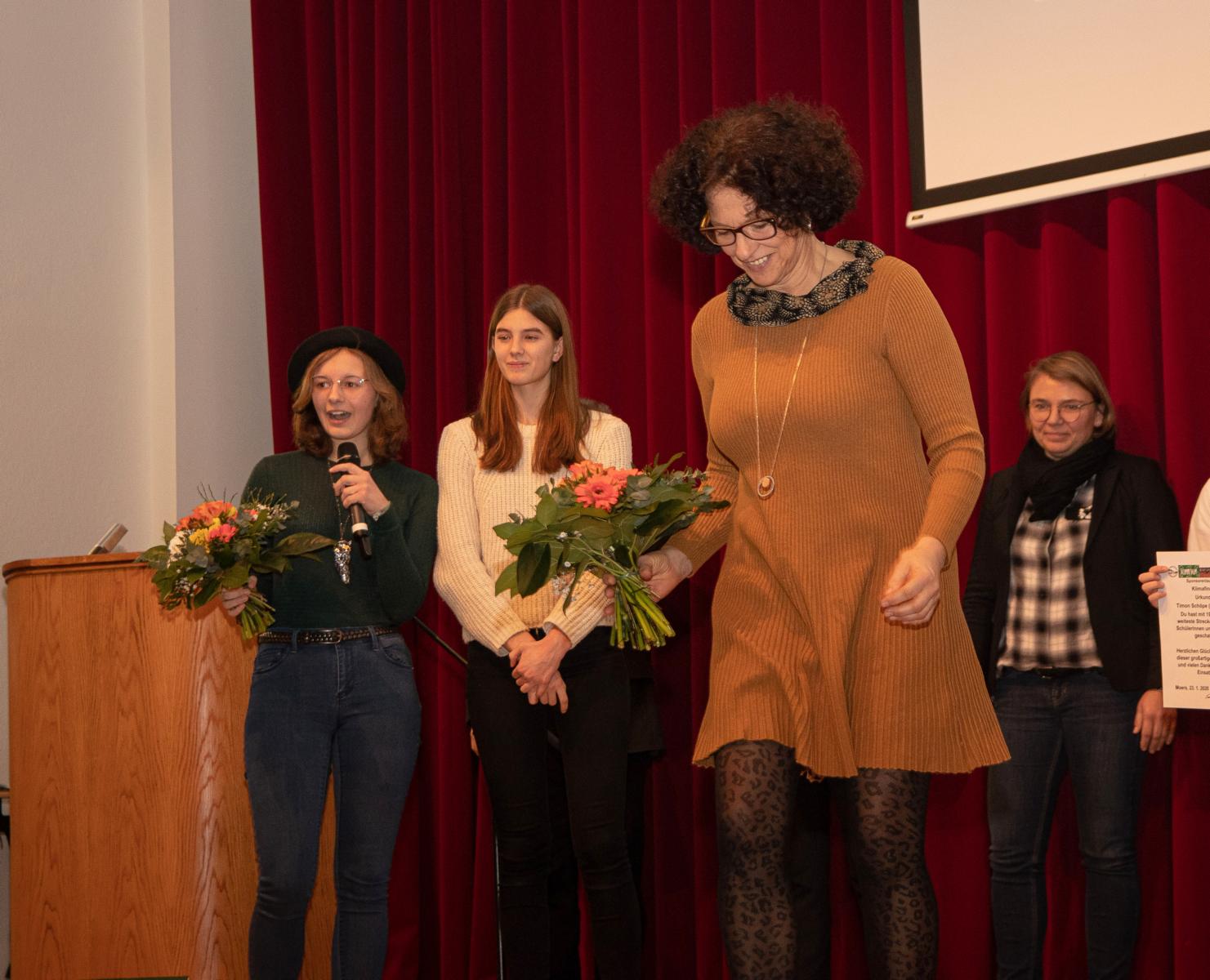 Ein ganz großes Dankeschön: Blumen für Schulsekretärin Simone van den Broek und Michaela Albus (Förderverein) für ihren großen Einsatz für das Klimafinum-Projekt.