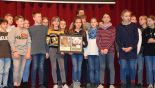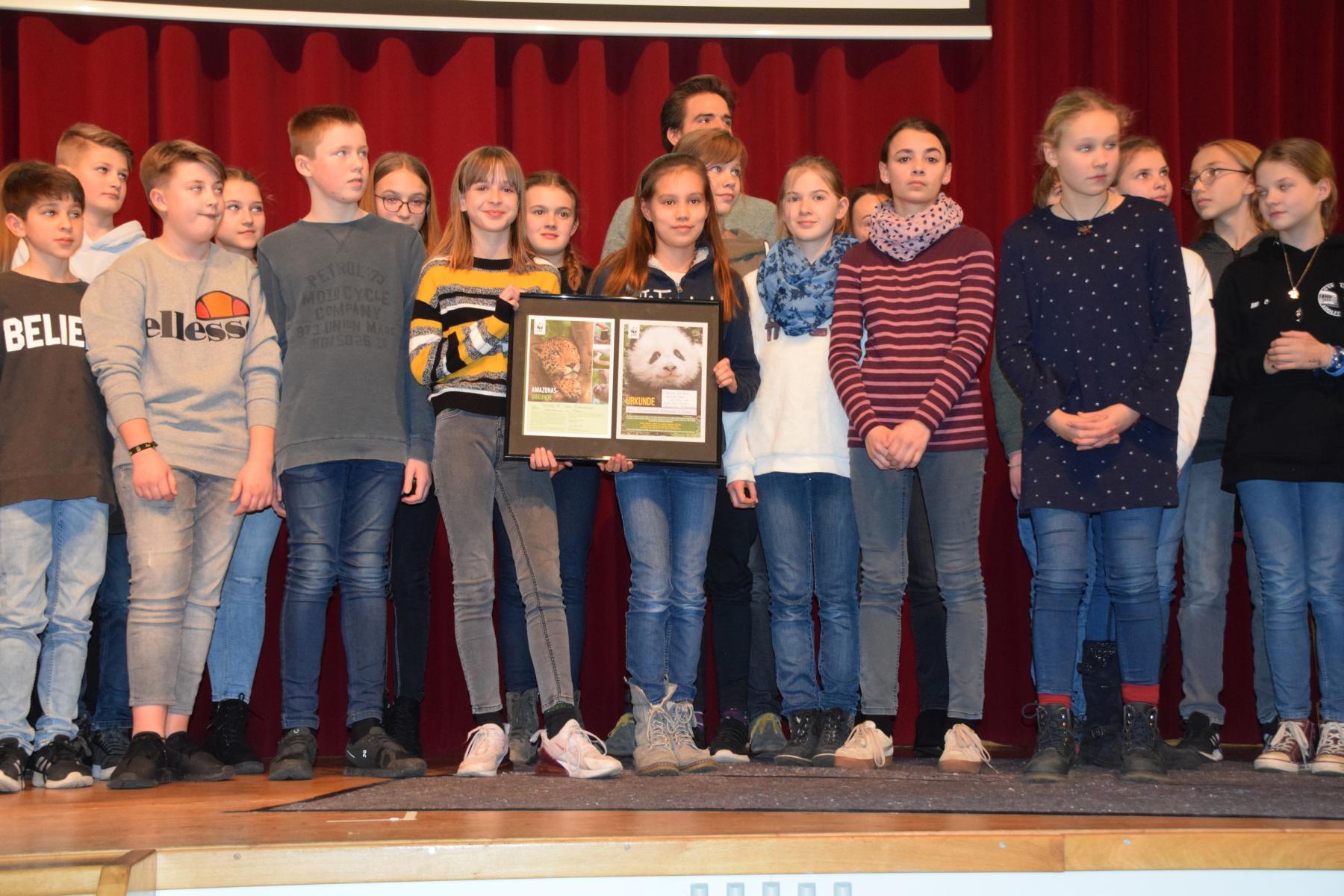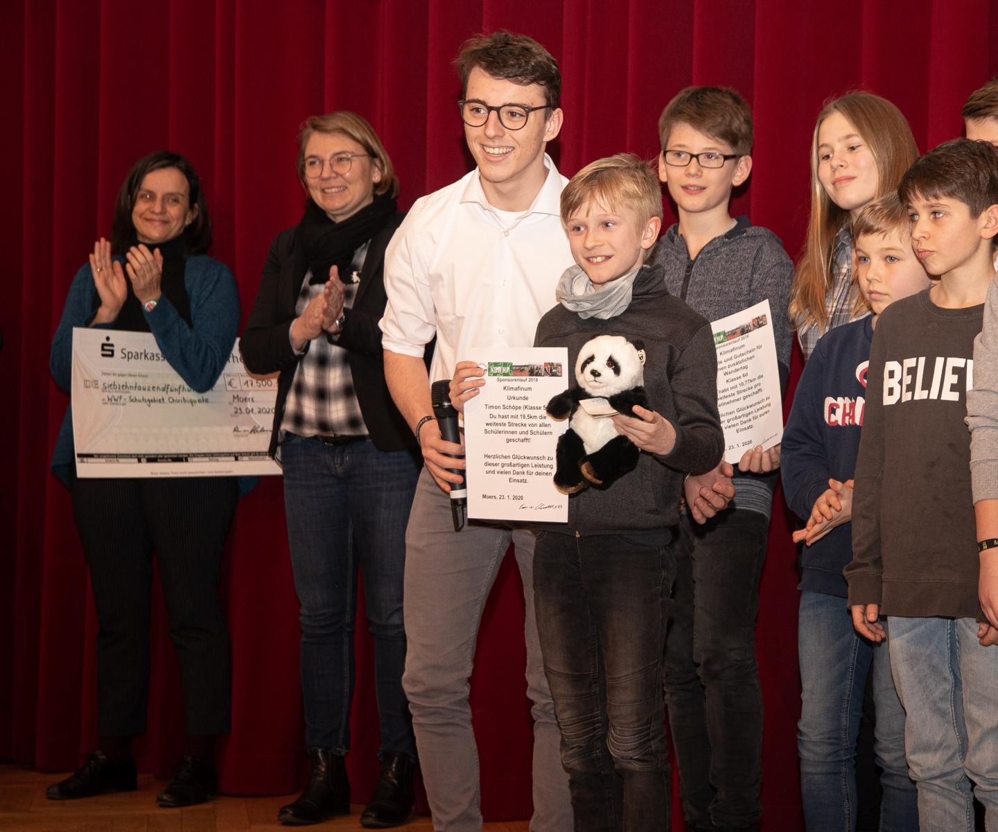 Noch wesentlich weiter schaffte es Timon Schöpe aus der 5d: Er hält mit 19,5 Kilometern den Streckenrekord beim Sponsorenlauf und freut sich über eine Urkunde und einen WWF-Panda, den ihm Niklas Klag überreichte.