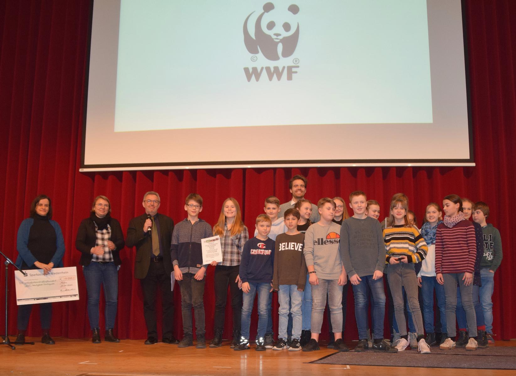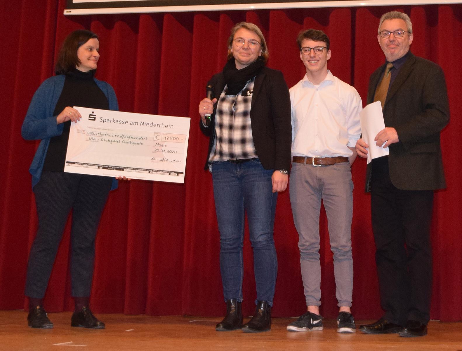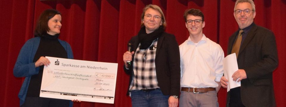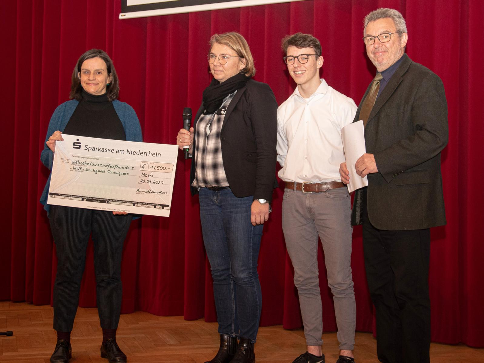 Übergabe des Schecks durch Angelika Jellessen (Schulpflegschaft), Niklas Klag (Schülersprecher) und Hans van Stephoudt (Schulleiter) an Dr. Julia Gorricho vom WWF Deutschland .