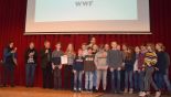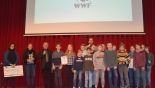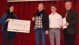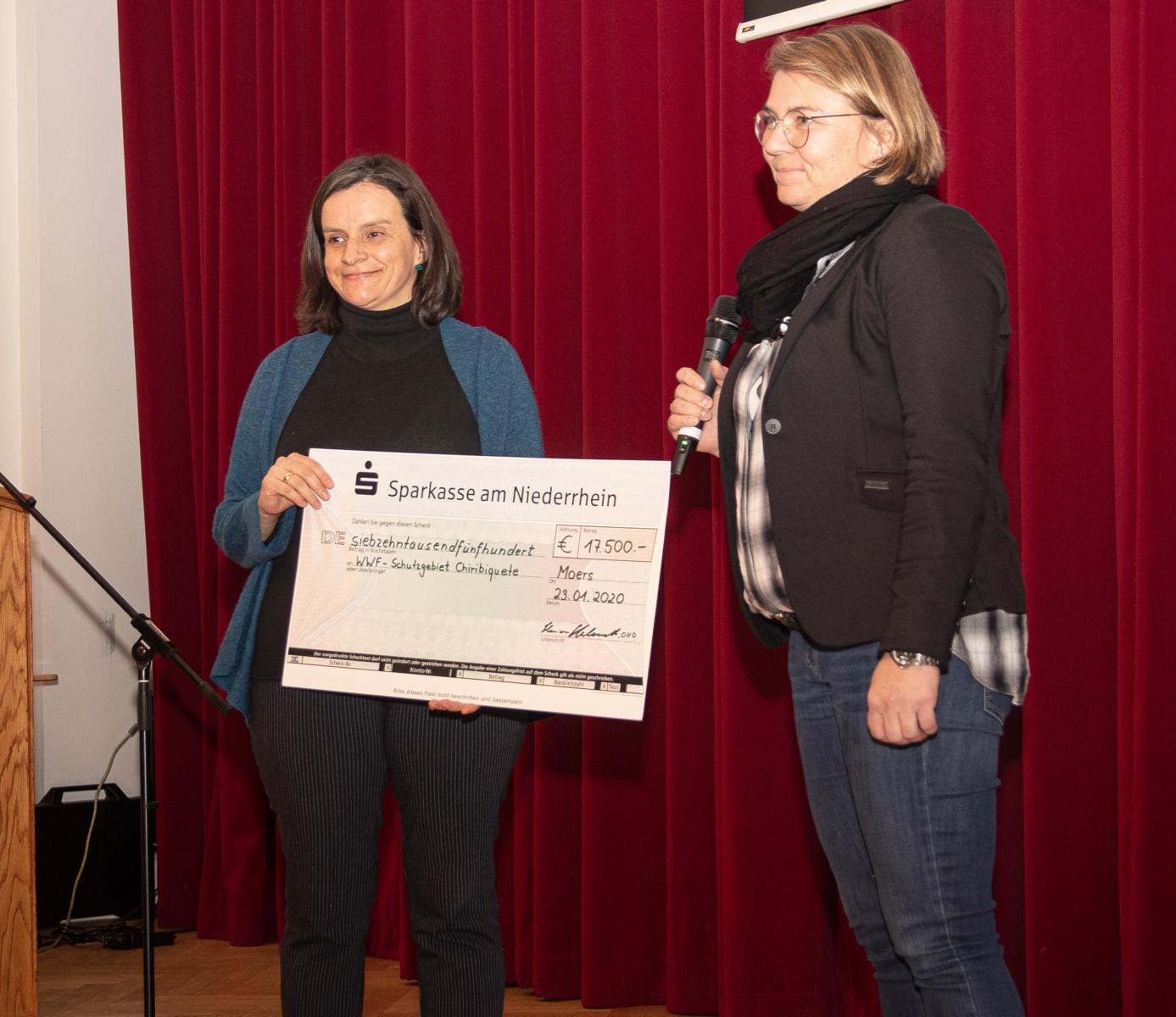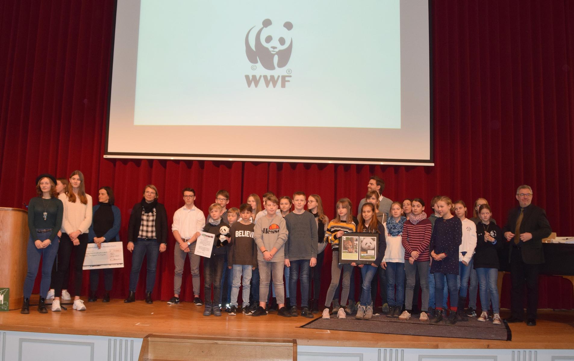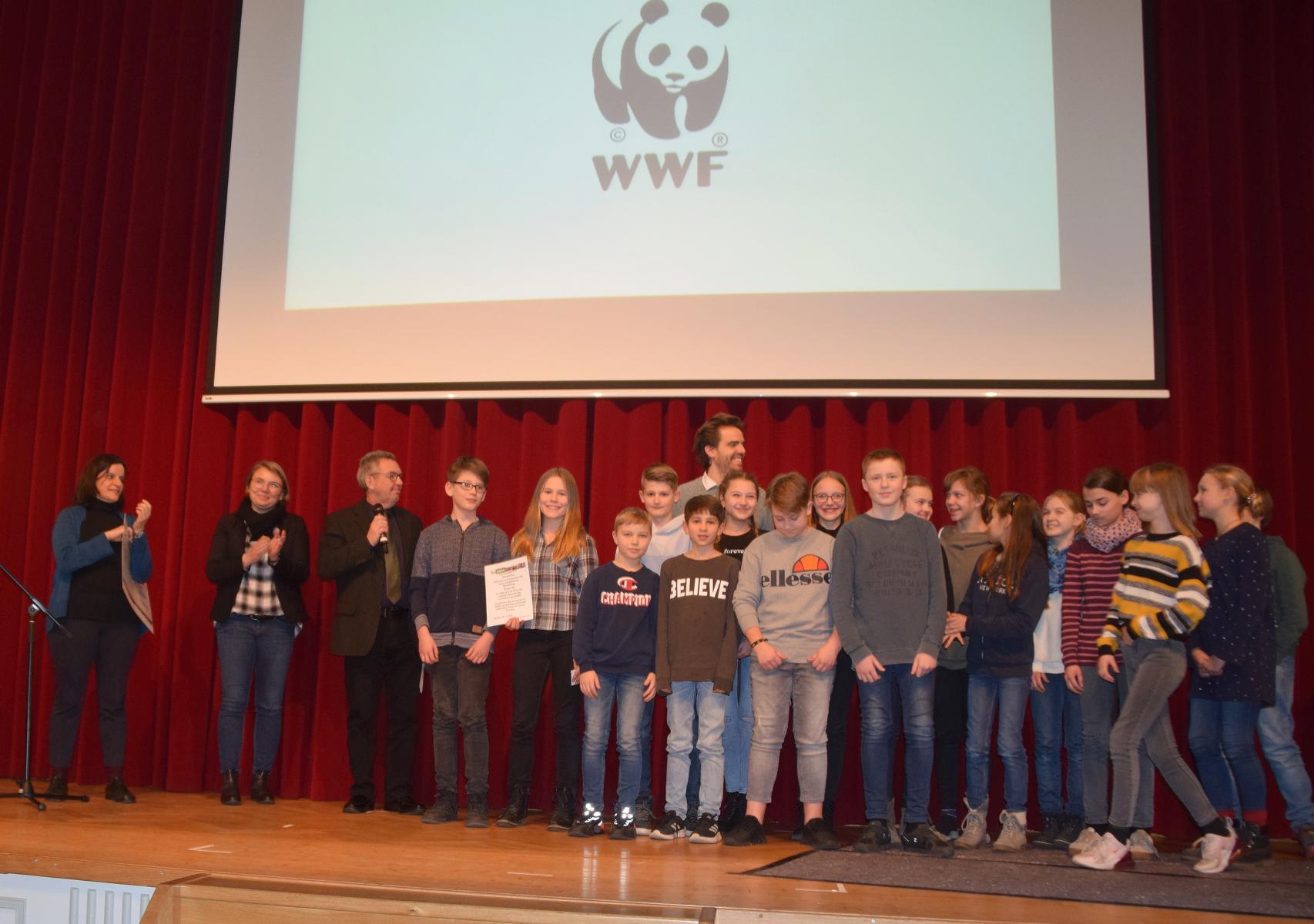 Übergabe des Schecks durch Angelika Jellessen (Schulpflegschaft), Niklas Klag (Schülersprecher) und Hans van Stephoudt (Schulleiter) an Dr. Julia Gorricho vom WWF Deutschland .