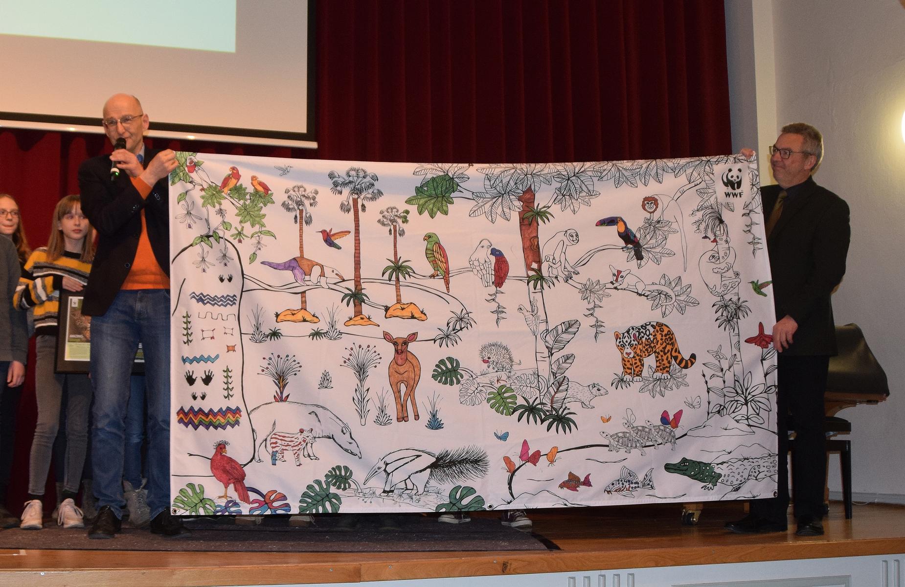 Die Spende in Höhe von 17.500 Euro wird für die Erhaltung des Chiribiquete Nationalparks in Kolumbien verwendet werden. Angelika Jellessen von der Schulpflegschaft, Schülersprecher Niklas Klag und Schulleiter Hans van Stephoudt überreichten den Scheck an Dr. Julia Gorricho. Über die konkreten Maßnahmen, die mit der Spende unterstützt werden, wird uns der WWF informieren. Für unsere Schule überreichte uns Frau Dr. Julia Gorricho das Ausmalwandbild „MalWild“ eines kolumbianischen Künstlers, das die Tiere im Schutzgebiet Chiribiquete zeigt. Die Gelegenheit, die ersten Tiere auszumalen, wurde intensiv genutzt.
