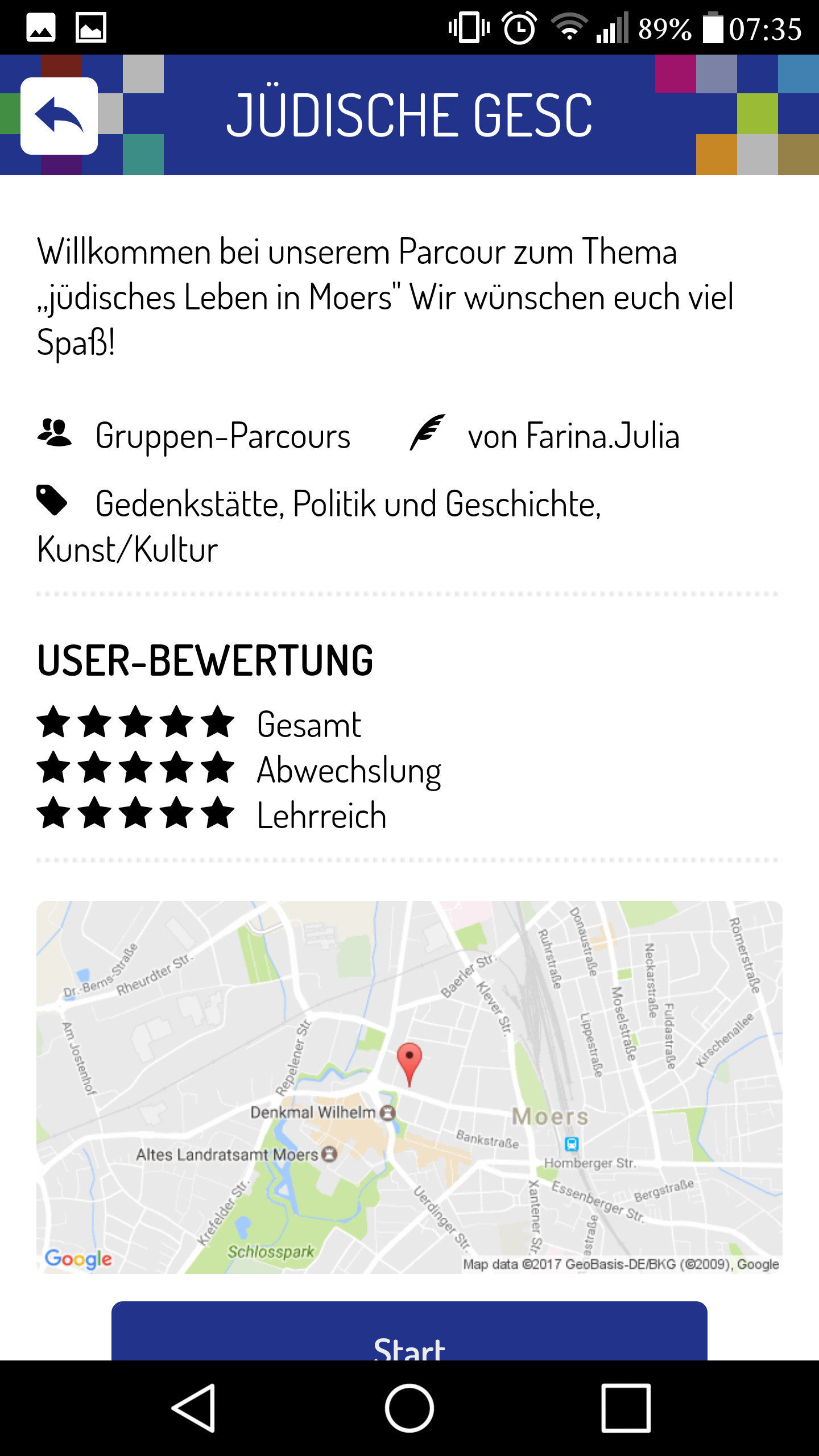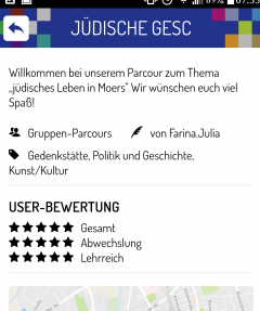 "Wir, Klasse 9a, haben uns im Geschichtsunterricht mit dem Thema „Juden“ beschäftigt und haben uns speziell über „Jüdisches Leben in Moers“ unterhalten. Dies hat uns dazu verleitet eigene Parcours, der Schnitzeljagd ähnlich, rund um das Thema „Jüdisches Leben in Moers“ zu erstellen. In dem Parcours wird man zu verschiedenen Standorten von zum Beispiel Stolpersteinen geführt und dort muss man dann verschiedene Aufgaben erfüllen, wie zum Beispiel ein Bild von dem Ort zu machen. Die einzelnen Parcours der verschiedenen Gruppen findet man über die dazugehörige App. Diese Parcours sind frei zugänglich und die Klasse würde sich sehr freuen, wenn viele Schüler/innen, Lehrer/innen und eventuell auch Eltern die Parcours mal ausprobieren würden."