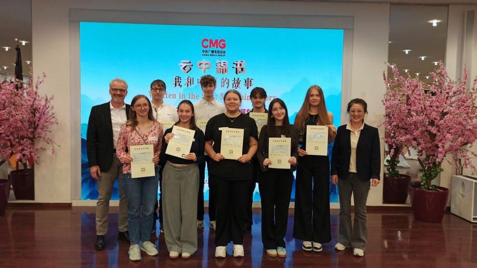 Nach einem Abendspaziergang durch Berlin-Mitte und einem authentisch chinesischen Abendessen am Hackeschen Markt war die Gruppe am 14. September 2024 zur Verleihung der HSK-Zertifikate (Sprachzertifikat für besondere Leistungen im Fach Chinesisch) in die chinesische Botschaft eingeladen. Die Feierstunde stand unter dem Motto “Written in the sky: My China-Story”. Neben Chorvorträgen und Festreden wurden im Rahmen einer Videoschaltung auch Glückwünsche von Astronauten der chinesischen Raumstation übermittelt. „Wir werden diese kleine Reise in die Hauptstadt in guter Erinnerung behalten“, meint Yihu Schlossarek, die seit vielen Jahren die persönliche „China-Story“ ihrer Schülerinnen und Schüler am Adolfinum prägt und über das Abitur hinaus verfolgt.
