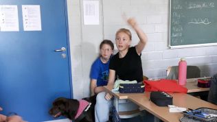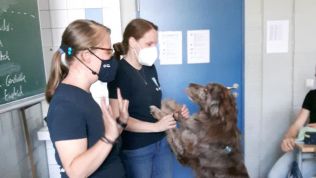 Nele schnüffelt derweil neugierig an Kinderbeinen, lässt sich streicheln. Die Hunde sind speziell trainiert, sodass ihnen auch die knapp dreißig Kinder in der Klasse nichts ausmachen. Sie haben ihre Abwehrreflexe abgelegt und müssen alle zwei Jahre einen Wesenstest machen: „Da werden die Hunde auch schon mal gekniffen oder an der Rute gezogen“, so Natalie Gutt. „Erst, wenn sie keine Anzeichen aggressiven Verhaltens zeigen, dürfen sie als Therapiebegleithunde arbeiten.“