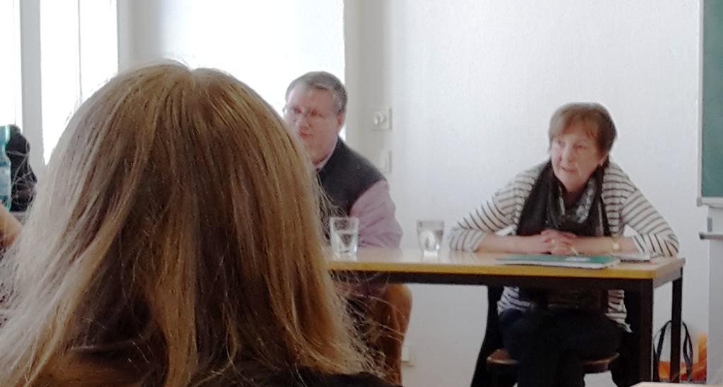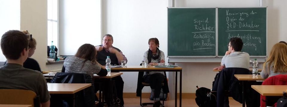 Als die Schüler und Schülerinnen der Klasse 9a am Dienstag nach der ersten großen Pause in ihrer Klasse eintreffen, werden sie bereits erwartet. Neugierig und fragend mustern sie die beiden fremden Gesichter, bis den ersten wieder einfällt, warum ein lächelnder Mann und eine ältere Frau vor ihnen stehen: Das Zeitzeugengespräch. Nachdem Geschichtslehrerin Dina Achtermeier ihre Schüler begrüßt und die Anwesenheit von Dr. Frank Hoffmann und Sigrid Richter erläutert hat, ruhen 25 interessierte Blicke auf den Gästen, die am Pult der Klasse sitzen.