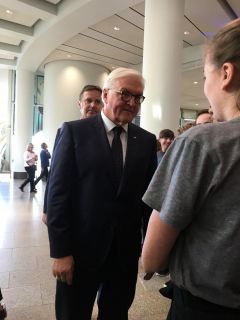 Aus organisatorischen Gründen stand mittwochs leider kein Raum zur Verfügung, in dem Ibrahim Yetim alle 88 Schülerinnen und Schüler der drei Klassen hätte sprechen können. So sprang netterweise René Schneider, Landtagsabgeordneter für den Wahlkreis Wesel II (Wesel die Gemeinden Alpen, Kamp-Lintfort, Rheinberg, Sonsbeck, Xanten und den Ortsteil Vluyn) spontan für eine Hälfte der Besuchergruppe in einem anderen Raum mit ein. Hierfür herzlichen Dank! Die Schülerinnen und Schüler, die den Landtag am Montag besuchten, hatten dann darüber hinaus die Gelegenheit das Staatsoberhaupt der Bundesrepublik Deutschland, Bundespräsident Frank-Walter Steinmeier, zu sehen, der seinen Antrittsbesuch in Düsseldorf absolvierte. Wirklich toll fanden alle, dass er auch mit einigen Adolfinern ein paar Worte wechselte und interessiert nachfragte, wie Laura Kurreck, Schülerin der Klasse 9a, in ihrem Bericht über den Besuch am Montag schildert:
