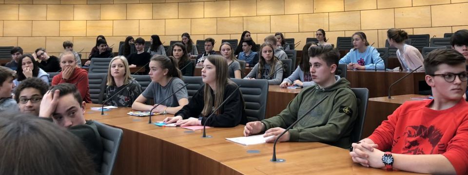 Als erstes wurden die Schüler in den Plenarsaal, welcher der Raum ist, indem die Sitzungen und die sogenannten Lesungen stattfinden, geführt. Die Sitzungen, die in diesem Saal geführt werden sind öffentlich und Sitze für Besucher und Medienvertreter sind vorgesehen. Die Schüler durften sogar auf den Sitzen der Abgeordneten sitzen und wurden vorher gebeten eine Rede zu dem Gesetzesentwurf, ob das Wahlalter auf 0 Jahre heruntergesetzt werden soll, zu schreiben. Die Schüler haben eine Sitzung der Politiker nachgespielt und nach und nach von der Partei mit den meisten Stimmen bis zu der Partei mit den wenigsten Stimmen, ihre Rede gehalten. Der geregelte Ablauf im Plenarsaal hat viele Schüler beeindruckt und begeistert.