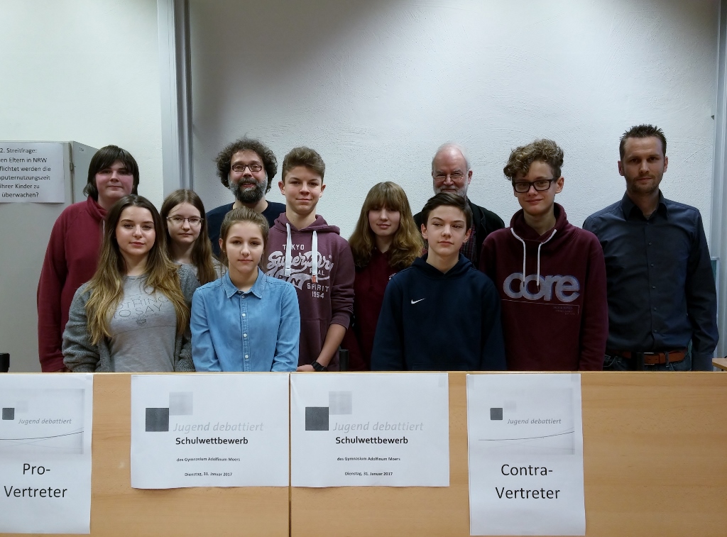 Am letzten Dienstag, dem 31. Januar 2017, stand in der 9. Jahrgangsstufe die Schulentscheidung für den politischen Wettbewerb „Jugend debattiert“ an. Vier der fünf Klassen sandten jeweils ihre zwei besten Vertreterinnen bzw. Vertreter in den Raum I27, um sich im diskursiven Schlagabtausch zu messen. Für die Klasse 9a traten Julia Weber und Ben Schwarz an, für die 9b Leonie Wallusch und David Leonhards, für die 9c Angelina Bramtchiyska und Lou Schulz und für die 9e Ines Marten und Phillip Reis.