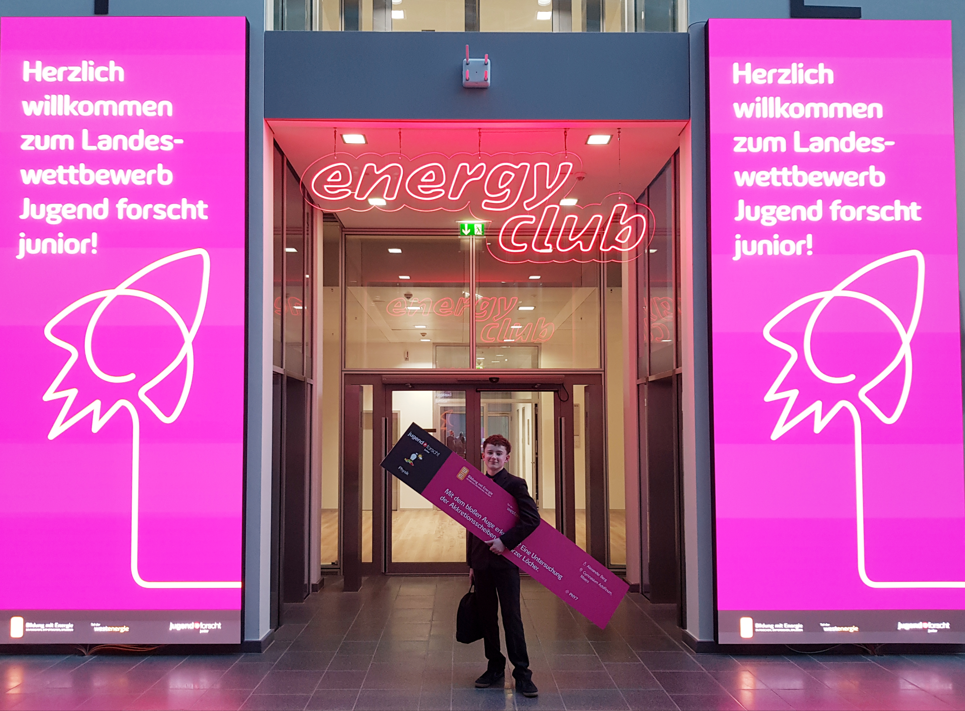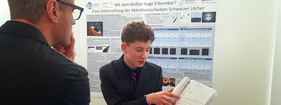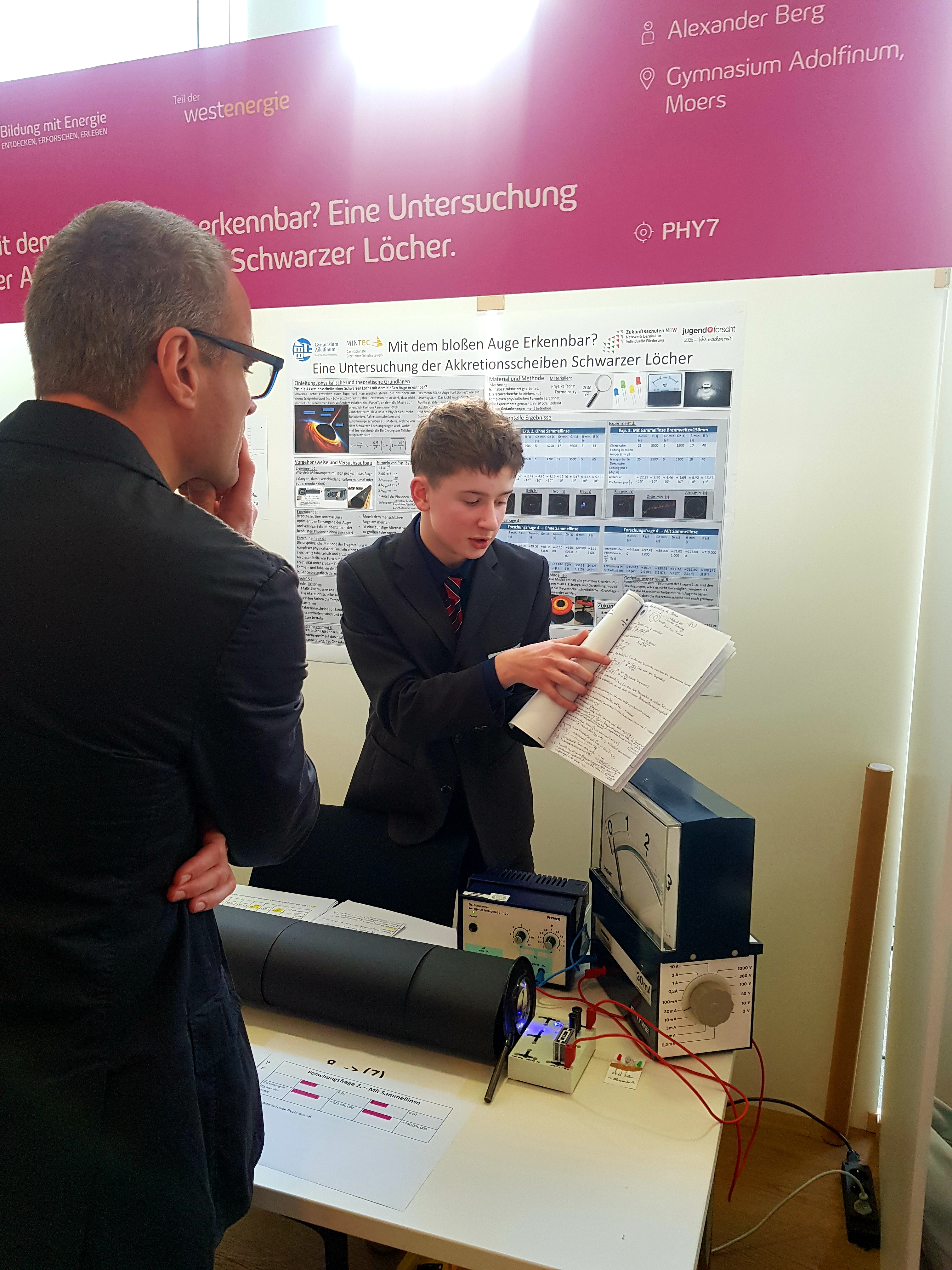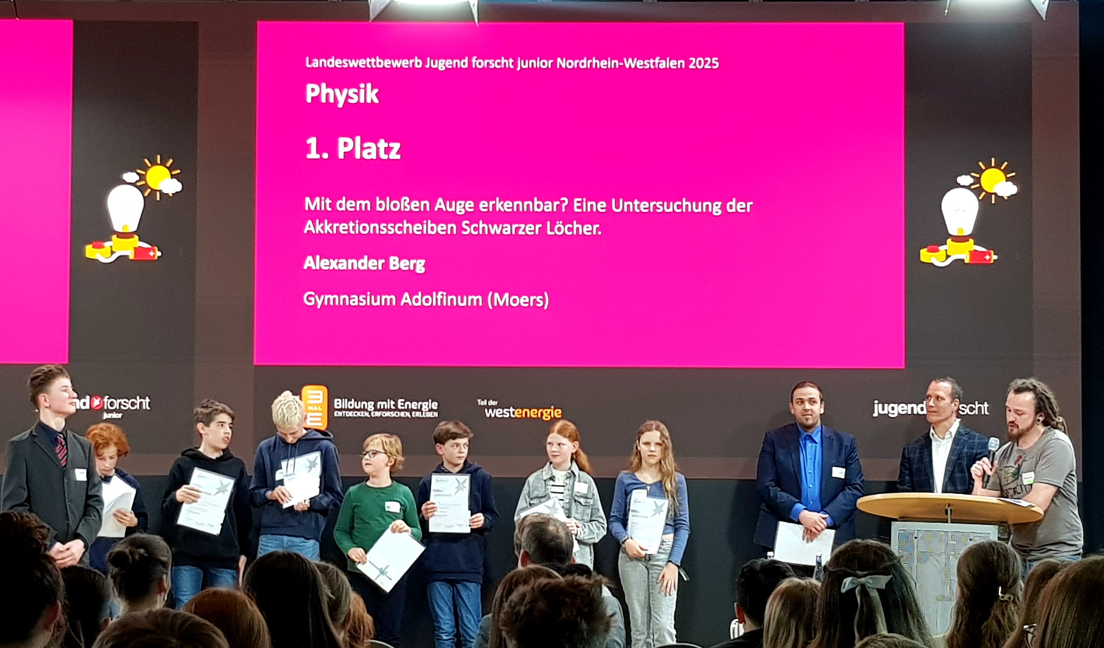 Mit seiner beeindruckenden Forschungsfrage: „Mit dem bloßen Auge erkennbar? Eine Untersuchung der Akkretionsscheiben Schwarzer Löcher“ begeisterte Alexander die Jury durch sein umfangreiches Fachwissen und seine experimentellen Leistungen. Am zweiten Präsentationstag setzte er sich erfolgreich gegen insgesamt 718 Jungforscher im Bereich Physik durch. Wie bereits auf der Regionalebene am 6. März 2025 in Krefeld, überzeugte er auch hier auf ganzer Linie und wurde mit der höchsten Auszeichnung – dem 1. Preis auf Landesebene – geehrt. Wir gratulieren Alexander herzlich zu diesem herausragenden Erfolg!