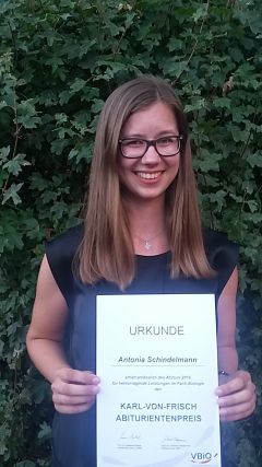 Antonia Schindelmann - Adolfinerin des aktuellen Abiturjahrgangs - wurde jüngst im Max-Planck-Institut in Dortmund mit dem Karl-von-Frisch-Preis ausgezeichnet. Der vom Verband Biologie, Biowissenschaften und Biomedizin (VBIO) ausgelobte Preis wird landesweit an höchstens 40 Schülerinnen und Schüler vergeben. Voraussetzung für den Vorschlag sind hervorragende Leistungen im Fach Biologie. So müssen die Zensuren in Biologie über die gesamte Qualifikationsphase in allen Halbjahren glatt eins sein.